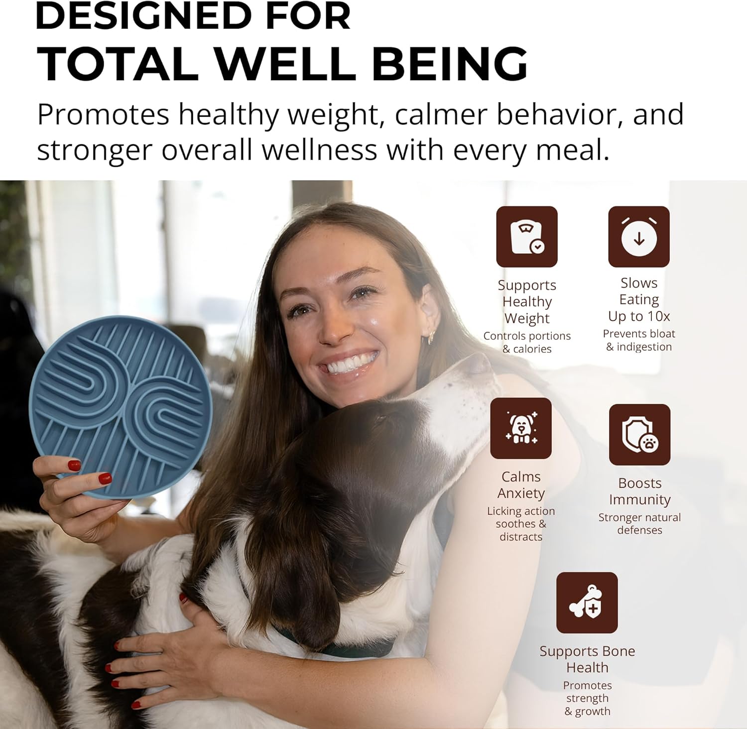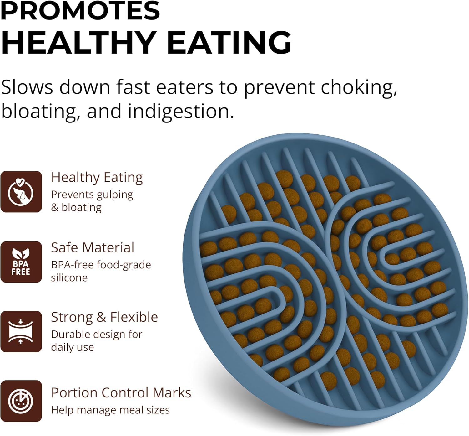 About this item SLOW FEEDING DESIGN - Features innovative maze-like design that naturally slow down your dog's eating pace, preventing gulping and promoting healthier digestion. This puzzle feeder dog bowl helps reduce bloating, regurgitation, and obesity in dogs of all sizes. DURABLE FOOD-GRADE CONSTRUCTION - Crafted from high-quality silicone that's completely food-safe. This dog slow feeder bowl withstands daily use and repeated washing while maintaining its shape and effectiveness for years of reliable service. NON-SLIP STABILITY BASE - Equipped with a secure non-slip bottom that keeps the bowl firmly in place during feeding time. This dog food bowl prevents sliding and spills, making mealtime mess-free for active puppies and dogs on any surface type. DISHWASHER-SAFE CLEANING - Designed for hassle-free maintenance with complete dishwasher compatibility. The smooth silicone surface prevents food buildup, ensuring your slow feeder dog bowl stays hygienic and ready for every meal. IDEAL FOR SMALL TO MEDIUM-SIZED PETS - Suitable for both medium and small slow feeder bowl needs, this design accommodates up to 2 cups of food. Ideal for puppies, dogs, and even cats. It works with canned food, raw diet or liquids. A multifunctional dog puzzle feeder bowl that helps every pet eat at a healthier pace. › See more product details