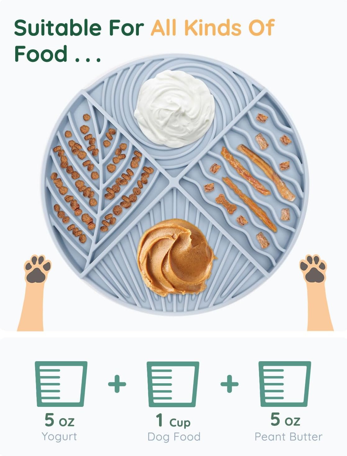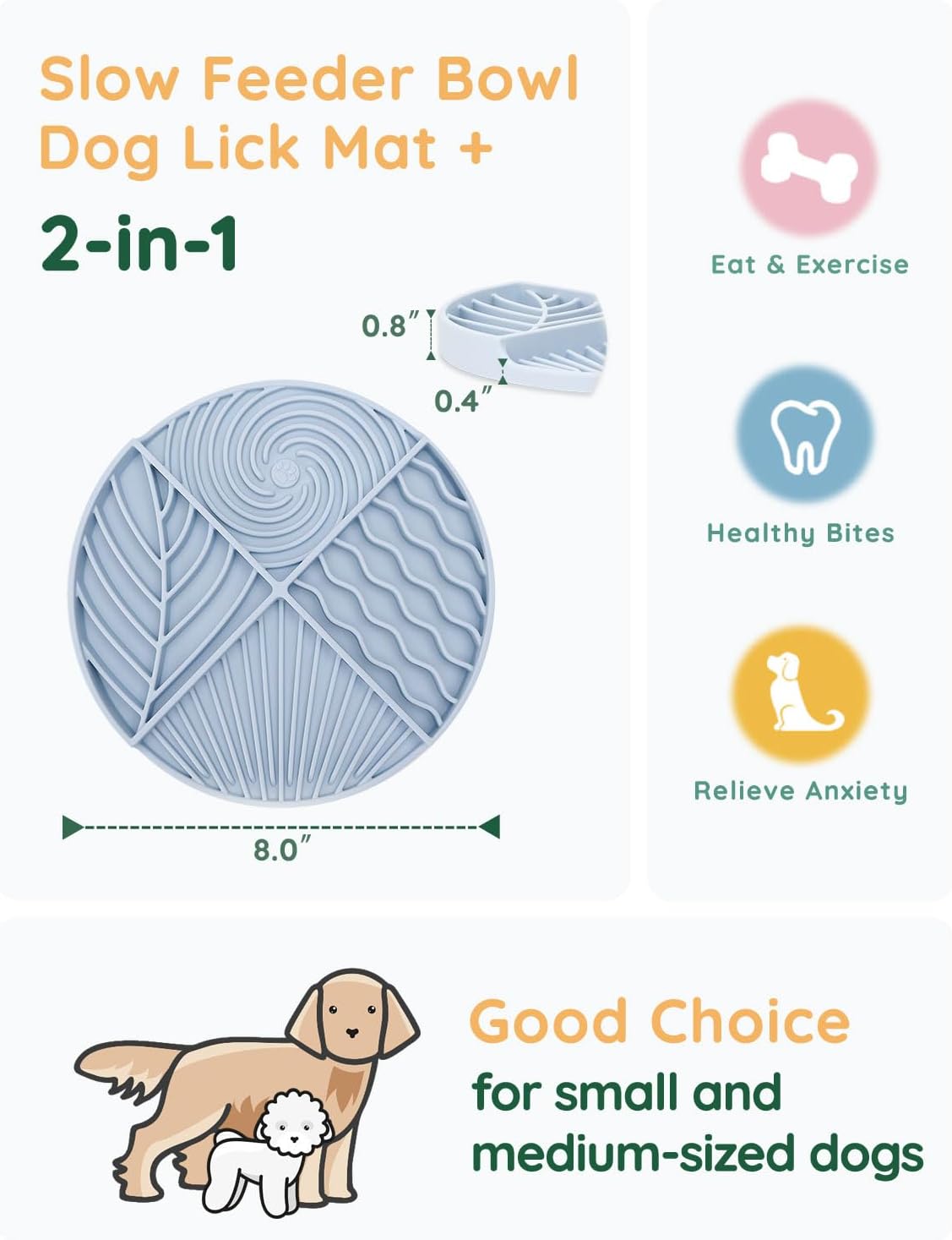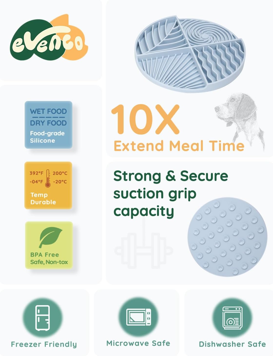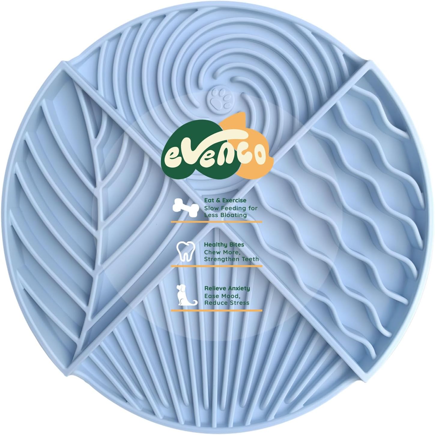 About this item FOUR LICKING TEXTURES: This innovative Licking Mat features four patterns that encourage licking, making your dog every mealtime a delightful adventure! We also make two sections deeper (0.8-in deep) to ensure they can lock different textures of foods and treats, like large-grain kibbles, yogurt, peanut butter, etc. Help your puppy maintain balanced nutrition! UNIQUE MAZE DESIGN: This slow feeder dog bowl is crafted with a unique maze pattern, making it more challenging for your dog to vacuum up food quickly. This design can extend meal times, aid digestion, and promote healthier eating habits—a dog supply You Won't Regret Buying. EASE MOOD & REDUCE ANXIETY: How did you deal with your dog's stress and anxiety? Our dog lick bowl is an ideal calming toy for soothing your dog during grooming sessions, vet visits, or stressful times. Simply spread your dog's favorite food on the bowl to distract and calm your dog, effectively reducing their anxiety. FOOD-GRADE SILICONE: Evenco portable bowl is made from durable, non-toxic silicone and can withstand damage from dog bites. Its substantial array of suction cups on the back ensures it adheres securely to flat surfaces, preventing spills and messes, even if your dog is enthusiastic during mealtime. EASY TO USE: Designed for convenience, this dog feeder is microwave, dishwasher, and freezer safe, ensuring easy maintenance. Its user-friendly design minimizes upkeep, freeing up more time for you to play with your pet, and improves the quality of your family life. › See more product details