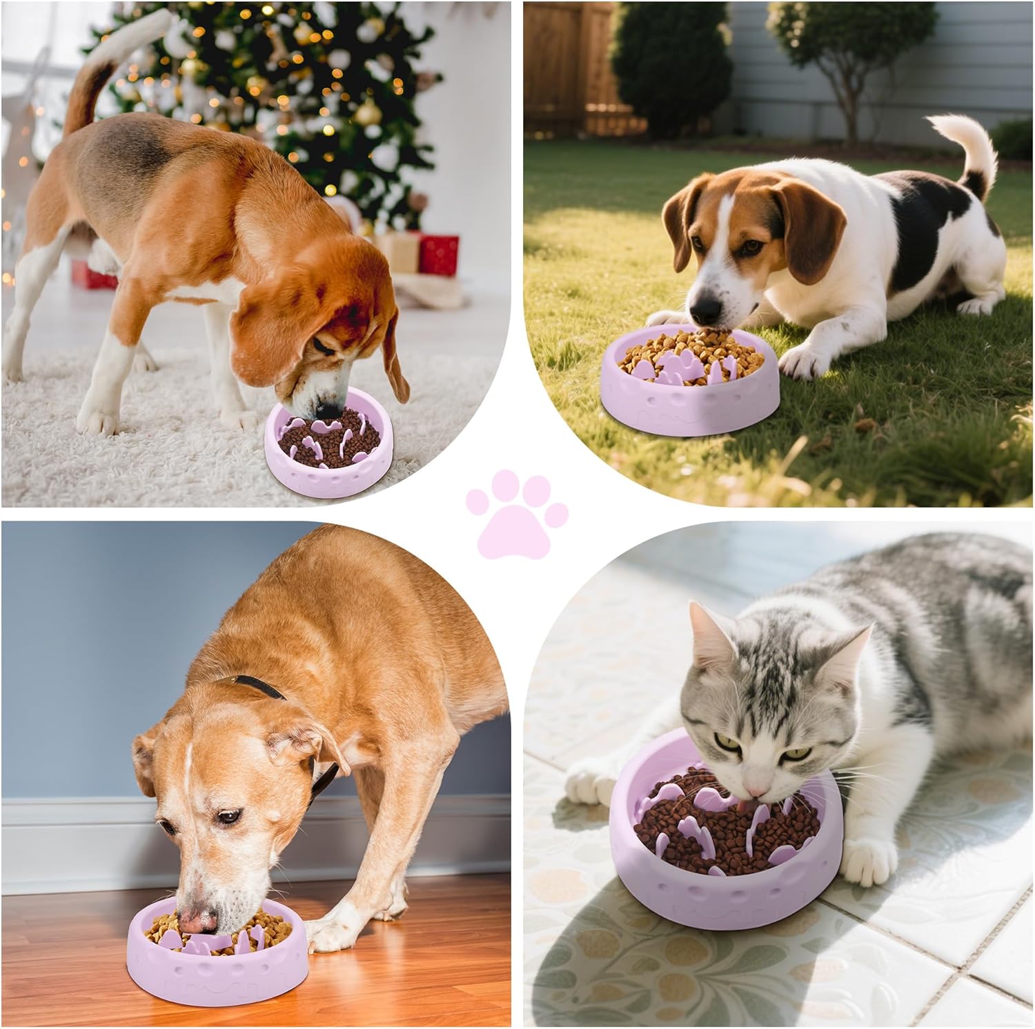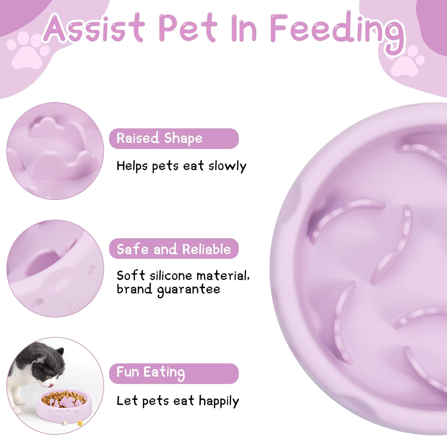 About this item 【Raised Maze Design to Slow Down Eating】The dog maze food bowl is designed with an internal spiral raised maze that guides the pet to explore the food path with the tongue, thereby extending the feeding time. Make eating more fun and challenging, suitable for puppies to large dogs, especially for gobbling pets, to prevent digestive problems such as choking and stomach bloating from the source. 【High-quality Silicone Material, Protect Pet Health】Made from high-quality silicone this dog slow feeder bowl, is free of BPA and heavy metal residues, and is resistant to bites and tears. The surface is smooth and seamless, does not hide dirt and dirt, is compatible with dry food and wet food, meets the diverse dietary needs of picky pets, and the bowl is light and fall-proof, and the puppy bite is also safe and worry-free. 【Suction Cup Base, Non-slip and Stable】The bottom of the silicone slow feeder dog bowls is equipped with a thickened suction cup, which improves the adsorption force after pressing, and is suitable for smooth surfaces such as tiles and wooden floors. Even if the excited pet pulls hard, the bowl remains stable and does not move, avoiding food spills and keeping the dining area tidy. 【Scientific Structure, Reduce the Risk of Vomiting】The raised spacing of the silicone dog bowls is designed with veterinarian recommendations to delay eating and avoid excessive frustration. Divide the grid to guide a small amount of multiple eating, promote saliva secretion and gastrointestinal peristalsis, reduce the probability of reflux and vomiting, especially suitable for pets who usually eat too fast. 【Easy to Clean】This slow dog feeder bowl can be turned and rubbed 180°, and food residues can be washed away in a single flush, and it is dishwasher compatible with cleaning. The flexible material is oil-resistant and non-staining, does not change color after long-term use, and has a matte light purple appearance, making it a high-value practical assistant for pet tableware. › See more product details