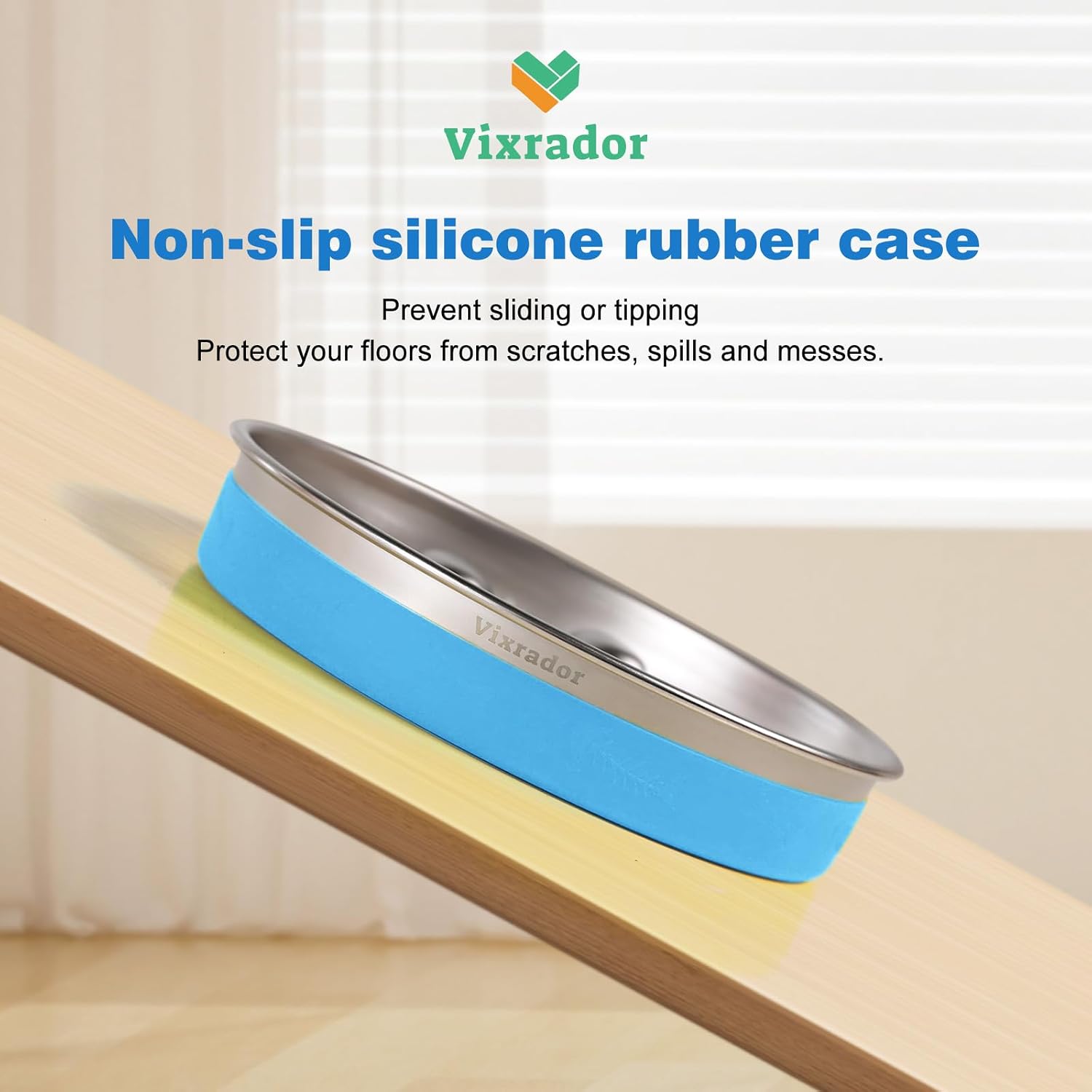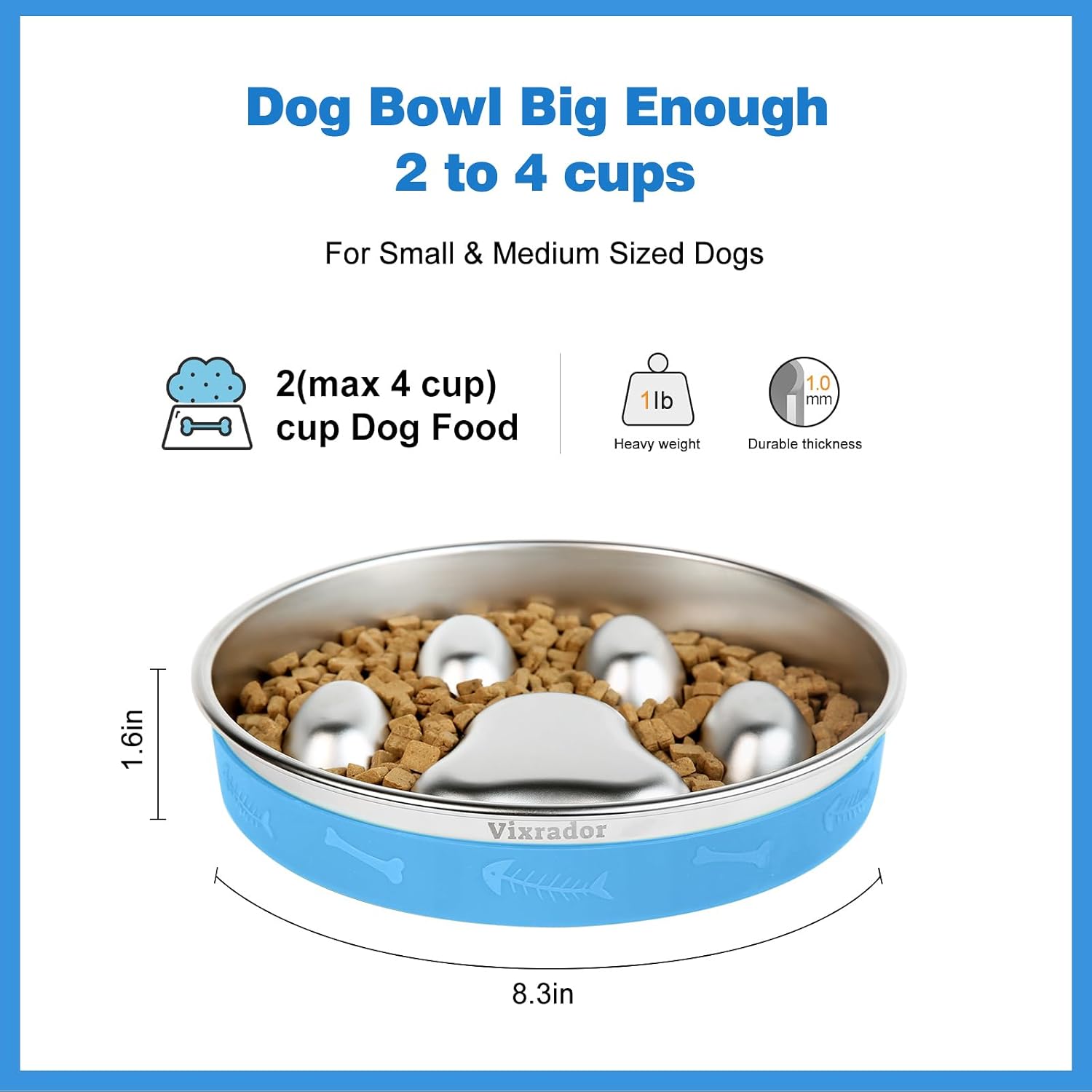 About this item 【Slow Feeder Design】:Vixrador slow feeder dog bowls with slow feeder design can slow down the eating speed and solve the problems of suffocation and help digestion,prevent excessive obesity caused by dogs eating too much too fast.The yellow new version offer higher and larger area of slow feeder design to keep better slow feeder effect. 【304 Food Grade Stainless Steel】:Vixrador slow feeder dog bowls are made from high-quality 304 stainless steel,which meets food safety standards, more long-lasting and safer, dishwasher safe,which is NOT easy enough to chew through like plastic or break like ceramic bowl. 【Blue Non-slip Case and Anti-rust Design Dog Bowls】:Dog Slow feeder Bowl has a non-slip silicone rubber case, preventing it from sliding or tipping over and provide stability, making it easier for your dog to eat, also protecting your floors from scratches, spills and messes,besides the blue color is a dog's favorite color as well as you.Metal stainless steel rust-resistant process design can ensure that the slow feeder dog bowls has a longer stand years of use.Suitable for slow feeder dog bowls small & medium sized dogs. 【Suitable for Small & Medium Sized Dogs】:Size:8.3x1.6inches.Capacity:You can hold 2 cups and up to 4 cups,suitable for small,medium sized dogs. Vixrador slow feeder dog bowls are ideal for serving dry,wet,canned and fresh food to meet your dog's different feeding needs. 【Easy to Clean】:With a high-end polished stainless steel design,Vixrador slow eating dog bowls WON'T hide dirt and are a breeze to clean. Also, dog bowl slow feeder are dishwasher safe and the non-slip silicone rubber case is also easy to clean, too. 【Tips】:To achieve the best slow feeding results, it's recommended to put 1.5 to 2 cups of food into a stainless steel slow feeder dog bowl. While the bowl can hold up to 4 cups, filling it completely will cover the internal barriers. This ensures that as the dog finishes the food on top, the bottom half will still slow down their eating. › See more product details