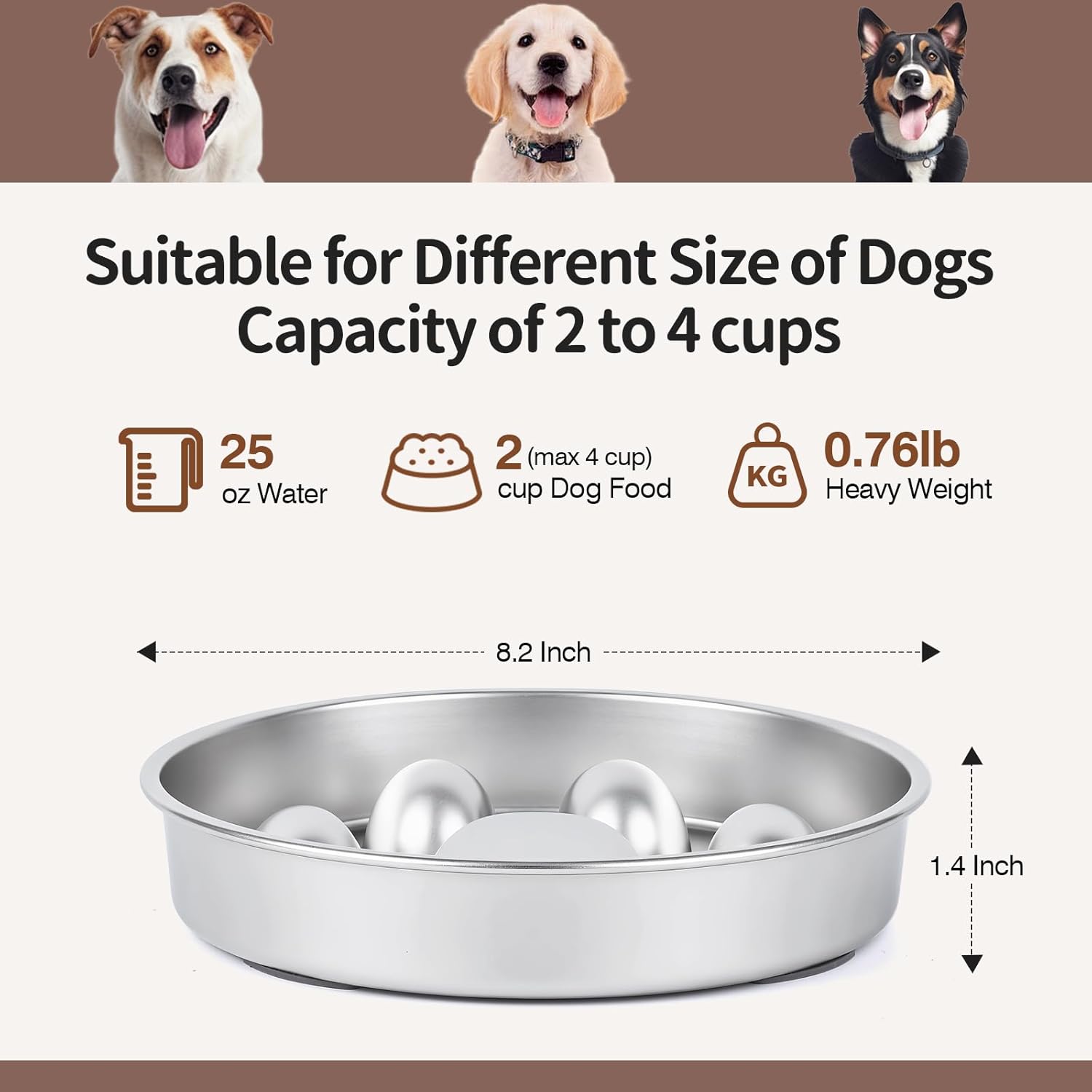 About this item 【The Design for Bowls】Our stainless steel slow dog feeder bowl physically prevents pets from eating too quickly by increasing the number of raised obstacles. Protect them and reduce the appearance of indigestion or vomiting. 【Healthy and Safe】The slow eating dog bowl is made of 304 stainless steel,which can be used in a healthy and safe way. It can be used to hold dry dog food,freeze-dried dog food,Wet dog food,Canned, Milk etc. 【Double-sided Feeding Bowls】When the dog bowl is used on the front, there is a non-slip base at the bottom to prevent it from sliding or tipping over; When used on the back, it can hold a variety of different types of food separately. 【Pleasure of Eating】The metal dog bowls come with a few other advantages like interactive toys. It can be used to provide enrichment for pets and to mentally stimulate them to work for their food. 【Easy for Clean】Food-grade stainless steel bowls are durable and easy to clean. It can dishwasher-safe and rust-resistant. › See more product details