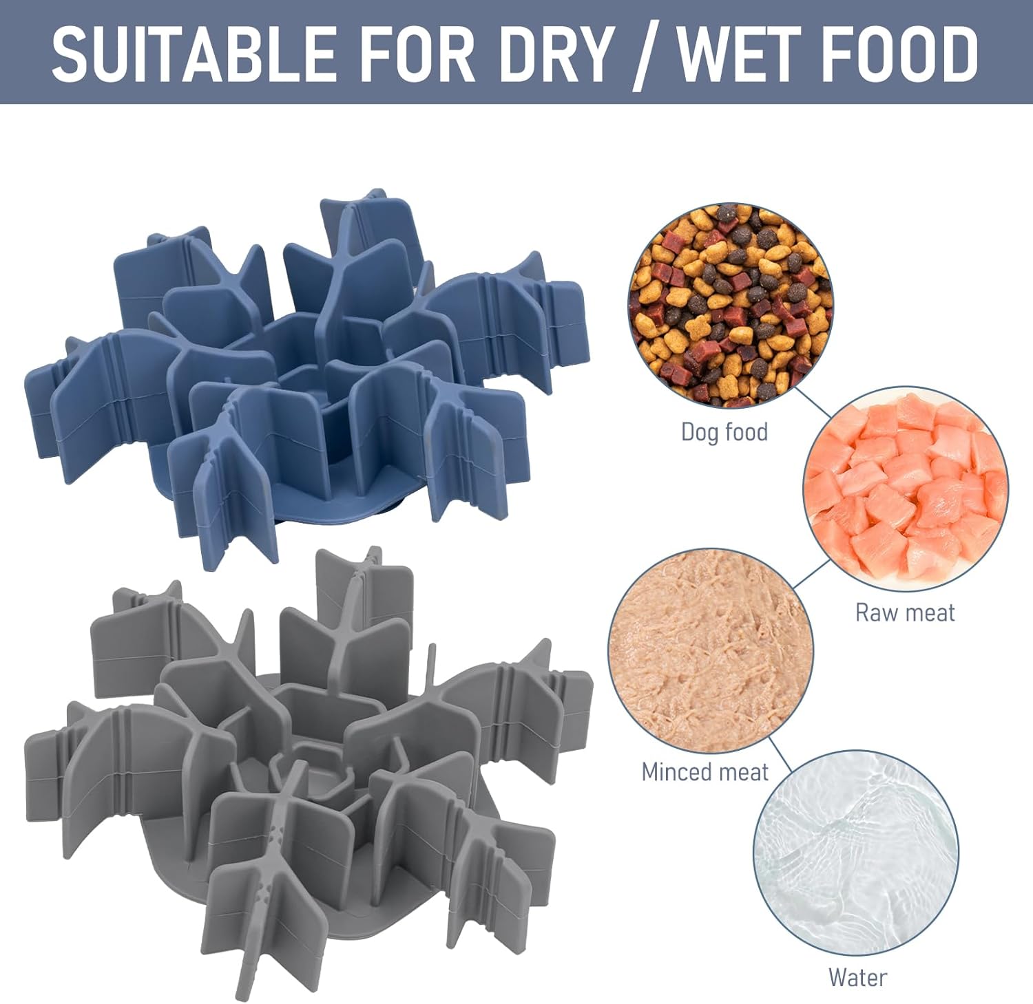 About this item Upgraded Feeder Level: This slow feeder bowl insert can slow down dog eating speed effectively, at least 5 times slower. As extra slow feeder insert with different curve parts and height of edges, would be harder than other slow feeder dog food mat. !NEW! Improved raised lip at the bottom prevent problem of hiding food. Cuttable Design: It is adjustable for slow feeder dog bowls, compatible size dog slow feeder insert standard medium, large feeding bowl 5.5-7.5 inches. There are 4 cutting lines and made of silicone slow feeder dog bowl insert is flexible for travel use. !Tip! Recommended sizes are based on flat bottom of bowls. Bigger Suction Cup: Our Mabnuby pet accessory dog bowl insert slow feeder has 8+1 XL strong suction cup anti slip from metal glass bowls, keep tight during mealtime. Simply lift one side of suction cup to pick up and clean can extend service life. Healthy Eating: The unique snow design for dog bowl slow feeder insert medium large breed avoid problems of digestion, choking, vomiting, and obesity, help pet develop good eating habit. Easy clean, dishwasher save. A nice gift for your friends. For Wet & Dry Food: Your pet can enjoy diet diversity using this slowfeeder inserts for dry wet or raw food dishes, can hold up to about 3.5 cups of dry food, also can increase pets feeding fun! Good match with stainless steels dog bowl. › See more product details