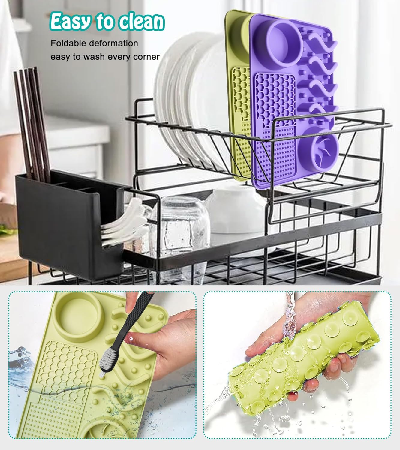 About this item Our dog lick mat feeder is made from premium grade, soft, dishwasher-friendly silicone with strong suction cups; Plus, it's versatile enough for both dry and wet food options and available in many colors. The multifunctional pet slow feeder with bowls includes a slow-eating bowl, a water bowl, a snuffle area, and a 3-pattern lick area, with a stainless bowl, silicone scraper and clean brush. Designed to cater to all your pet's needs in one innovative solution, it accommodates different food types and is ideal for most dogs' daily eating and play activities. More than just a feeder, our versatile dog bowls help alleviate your dogs' anxiety and stress in various situations, whether during outings, grooming, or vet visits. It's the perfect companion for your dog. Elevate your dog's mealtime experience with this innovative dog lick mat. It features an engaging maze pattern that stimulates dogs mental engagement, making your little one mealtime fun and promoting slower eating for better digestion. A great choice in pet supplies, is made from durable, non-toxic silicone and can withstand damage from dog bites. Its strong suction cup base securely attaches to flat surfaces, preventing spills and mess, even if your dog is enthusiastic during mealtime. › See more product details