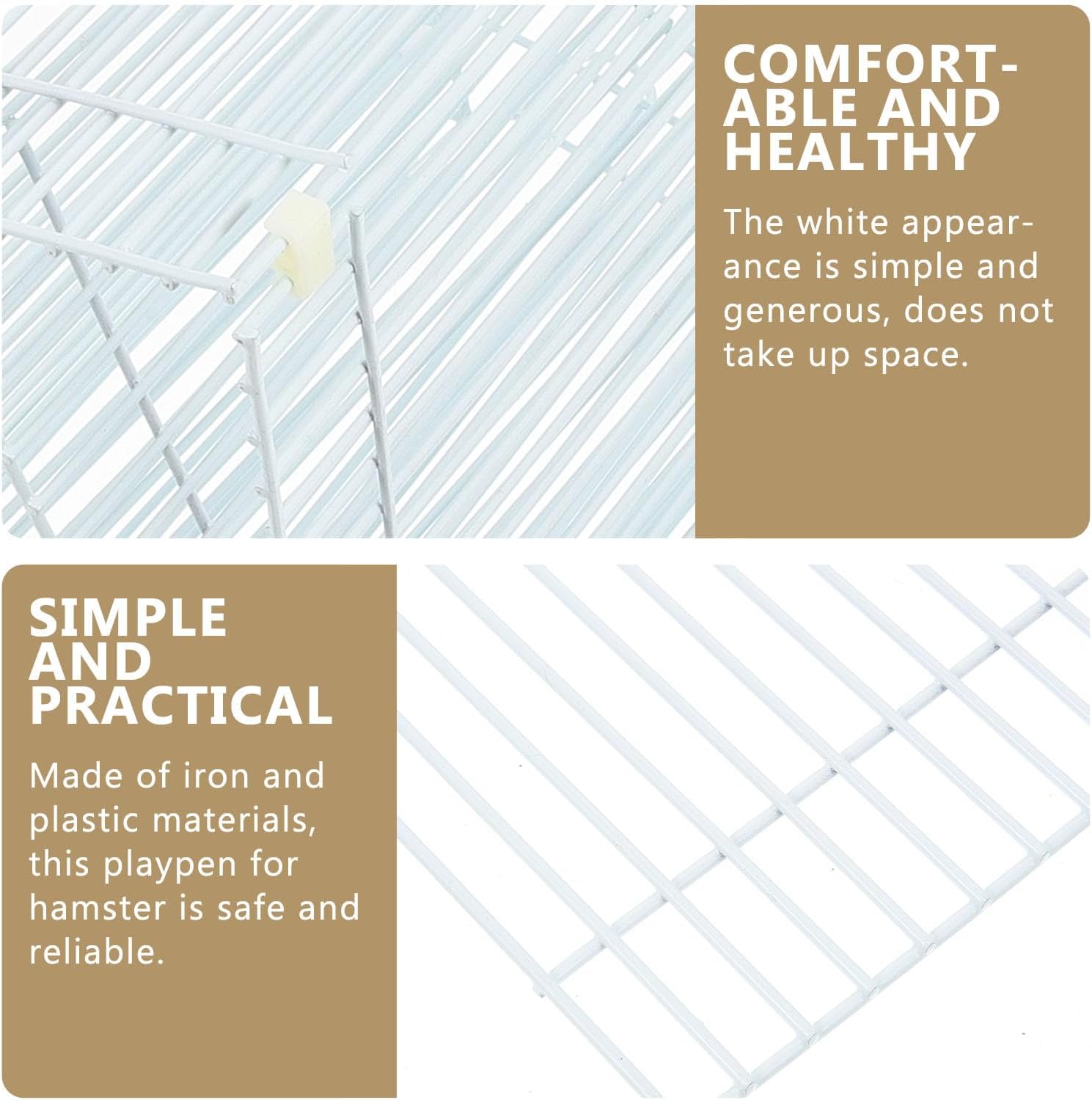Package Include 12 x Hamster Playpen Panels Characteristics -Material:Iron wire, plastic -Product Info:Fence -Color:White -Size: 22.70X15.00X0.10cm/8.92X5.89X0.04in - The material is tough and durable, and this playpen is not easy to damage or break. - This small pets as a pet cage, providing enclosure to play and rest small animal playpens. - This playpen is very durable and resistant to scratching, can serve a long time of use panel playpen. - Simple in structure, easy to assemble and disassemble, this pet playpen is easy to use small animal fence. - This playpen is built with iron wire and plastic materials to withstand biting or scratching from pets, which designed to endure pets claws.Goods Descriptionportable pet playpen It is suitable for the most kinds of pet! It creates place that is large enough to isolate your beloved pet.metal hamster playpen A sturdy fence provides easy access as well as a durable fence to keep your pet from animals outside.small animal playpen Are you looking for a playpen for your small pet? This playpen panels can be easily assembled, to keep your pet and protected with this fence