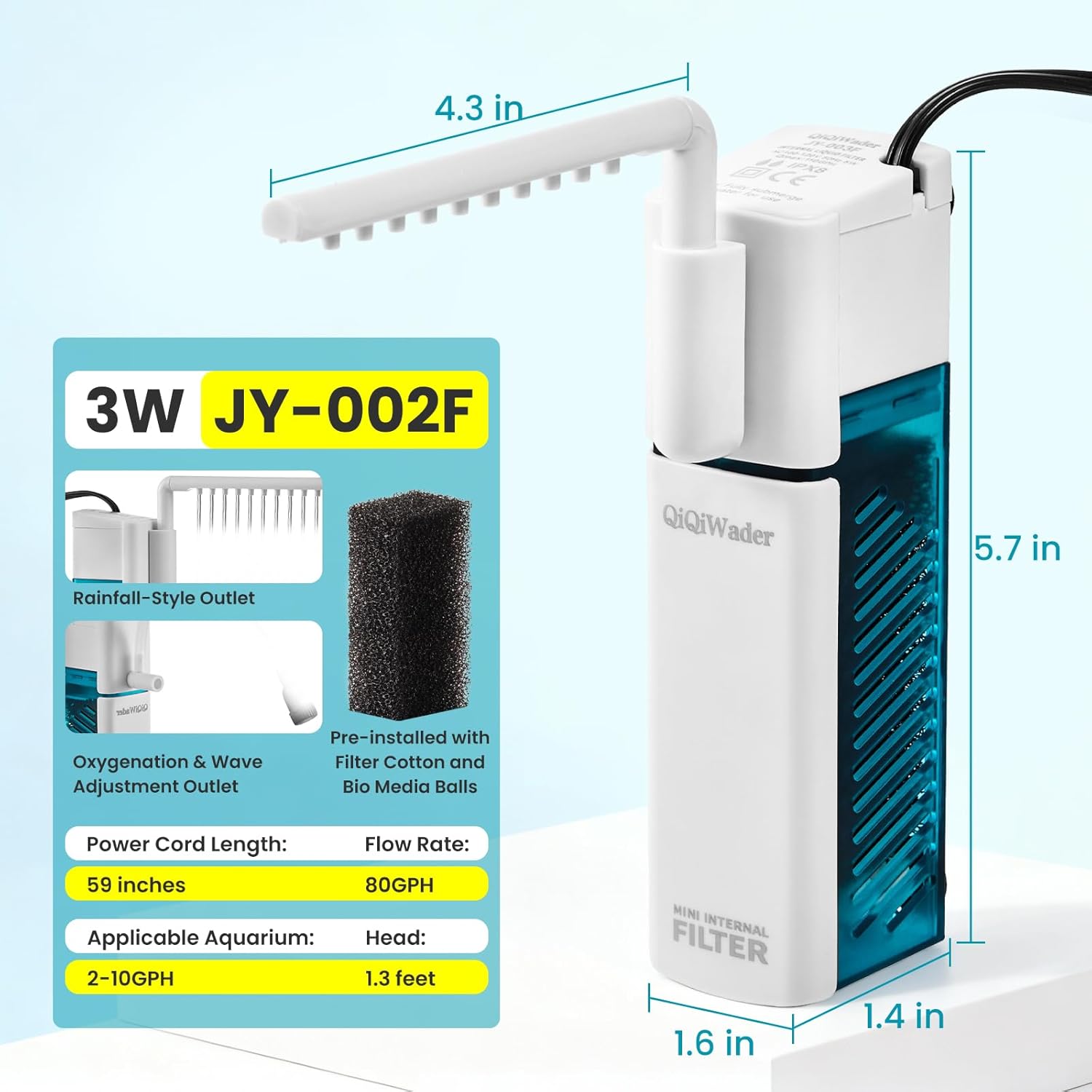 Parameters: aquarium filter, 3W, 80 GPH, lift 1.3 ft. Perfect for small aquariums, it features compact dimensions (1.6"L x 1.4"W x 5.7"H) that take up minimal tank space. Multi-function: This aquarium filter integrates filtration, water circulation, wave-making, oxygenation, and simulated natural rainfall. It comes with two interchangeable accessories—a spray bar and an oxygenation wave-making nozzle—It can be replaced as needed based on the requirements of your aquarium. Biochemical Sponge: Retains physical impurities (such as fish excrement and uneaten food) to help keep the water clear. Paired with a small amount of biological filter media balls: They can cultivate nitrifying bacteria to maintain the balance of the aquatic environment. Easy installation and maintenance: Powerful suction cups ensure secure attachment. Components are easy to replace, and the filter compartment is removable for convenient cleaning of the filter cotton. Recommended cleaning frequency: every 2–5 weeks (may vary based on aquarium conditions). Quality Commitment: Each pump undergoes industry-standard pressure testing before shipment and comes with a one-year limited warranty covering manufacturing defects. For any quality issues, please contact us via the Amazon Message Center, and we will provide a resolution in accordance with Amazon's policies. › See more product details