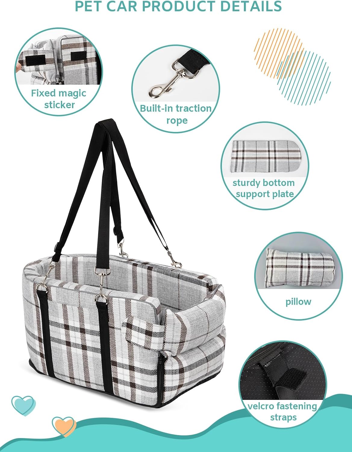 About this item 【Non-slip firm】This new version of the centre console bag has two adjustable straps that attach to the driver and passenger headrests. The Puppy Centre Console Car Seat prevents the bag from sliding around while the car is in motion, ensuring your dog's safety. The straps are removable and conveniently fit into the side pockets when not in use! 【Durable Material】Crafted with 260D high-density sponge and Quilting Fabric,our car dog seat booster a soft and comfortable experience.The zipper design allows for easy removal.The detachable pad is very easy to wash and maintenance,guaranteeing a tidy environment for your pet.Make your trips with your beloved pet more delight.The upgraded model comes with a sturdy bottom support plate that keeps your dog safe from collapsing or slipping out.It includes a sponge pad for all seasons 【Suitable Size】Size of our dog booster seat is 17.7*10.2*8.6 inches,perfectly fitting most car consoles.making it suitable for pets weighing less than 13 pounds and with a body length of 11 inches or less (from neck to tail).It securely fastens to your car's armrest,ensuring a safe and comfortable ride for your dog or cat 【Fits Most Cars】The console dog car seat is compatible with most car models(Fits centre console with cover).Before purchasing,please ensure that the width between two seats is greater than 7.5".It's suitable for the majority of car widths.However,please note it's not suitable for vans and trucks 【About packaging】In order to favour the transport we used vacuum packaging, after receiving the parcel, the use of iron or dryer can be quickly rebound sponge, any problem you can feel free to contact us › See more product details