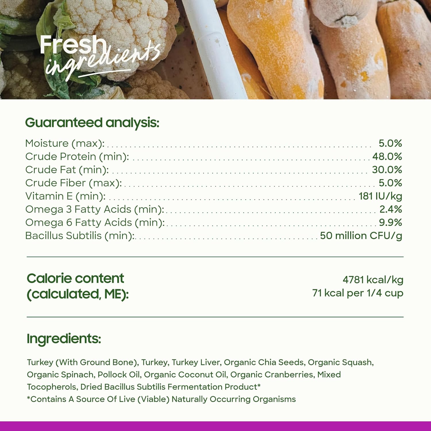 About this item High Protein & Nutritious: Made from 100% freeze-dried turkey, including turkey liver & ground bone for a quality, protein-rich treat or meal topper. Organic Ingredients: Contains organic chia seeds, squash, spinach, coconut oil, and cranberries for added health benefits and rich flavor. Includes Bacillus Subtilis probiotics to support healthy digestion and improve your dog’s immune system. Grain-Free & Natural: No fillers or grains – just responsibly sourced turkey, organic produce, and quality supplements. Versatile Usage: Can be served as a healthy treat, dog food topper, or cat food topper to enhance your dog's current diet with extra nutrients and flavor. Dogs Love the Taste: This high meat content and tasty freeze dried treats recipe ensures your dog will love every bite, whether for treats or food enhancement. › See more product details