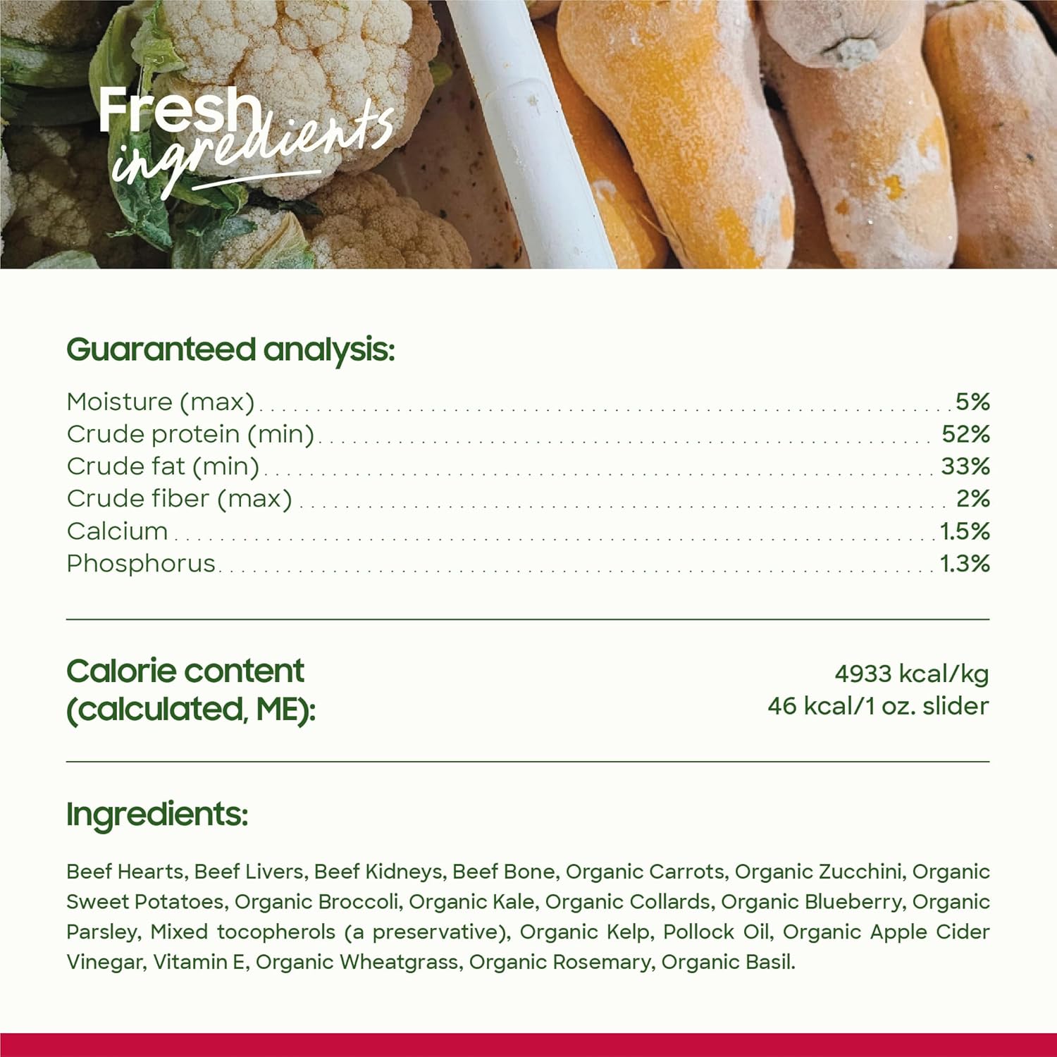 About this item High Protein Raw Dog Food: Smallbatch Pets raw freeze dried dog food made with 88% grass-fed beef, 10% organic produce, and 2% natural supplements to support optimal canine health. Single Source Protein: Grass-fed beef hearts, livers, kidneys, and bones ensure a natural, wholesome source of protein and nutrients in this healthy dog food. Complete & Balanced: Meets AAFCO nutrient profiles for all life stages (excluding large-size dogs) with essential vitamins, minerals, and supplements. Easy to Rehydrate: Simply mix with water to serve. Crush sliders and rehydrate for a few minutes, creating a nutritious meal for your dog. Can also use as a dog food topper or dog treat. USA Made & Organic: Our grain free dog food for adult dogs and puppies is crafted in the USA with organic, humanely raised ingredients, ensuring a quality, nutritious raw diet for your dog. › See more product details