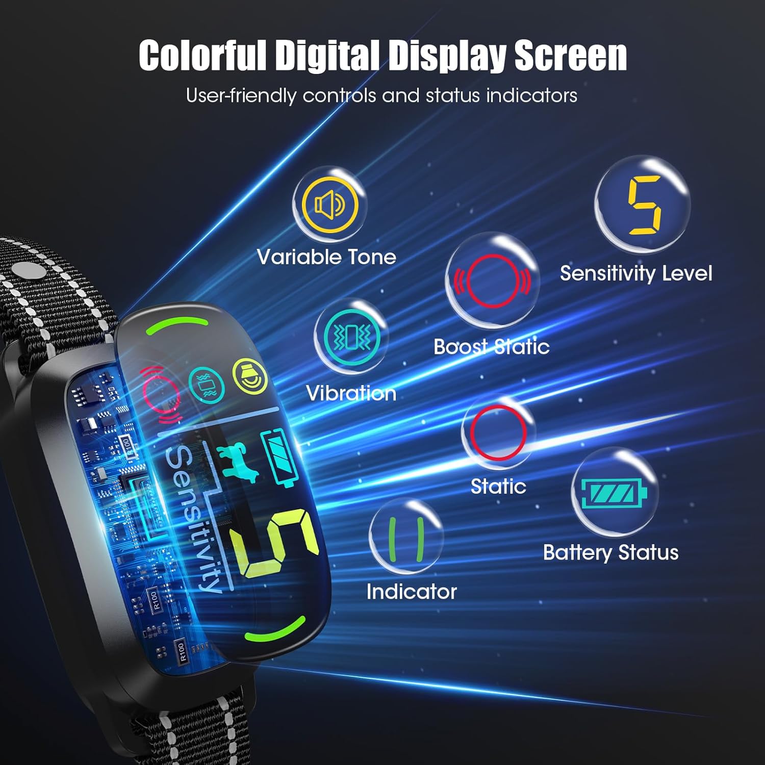 About this item 5 Smart Training Modes & 5 Adjustable Sensitivity Levels with Forced Bark-Stopping: Oliry bark collar features 5 effective training modes: Beep, Vibration, Beep+Vibration, Beep+Vibration+Static, and Boost Static+Beep+Vibration — combined with 5 adjustable sensitivity levels for customized training. Gently correct unwanted barking and stop stubborn barking instantly with safe, flexible, and personalized bark control Advanced AI Chip & Instant Bark Detection: Upgraded anti barking device with smart AI technology and voiceprint recognition. The bark collar for dogs responds in just 0.01 seconds, filters out other noises, and prevents false triggering for precise and safe bark control Rechargeable & Easy-to-Use LCD Screen: This rechargeable dog bark collar charges in 2 hours and lasts up to 18 days. The clear LCD display shows battery level, sensitivity level, and working mode for hassle-free operation. Type-C charging cord prevents loss Fits Dogs of All Sizes: Adjustable bark collar fits dogs from 8 to 150 lbs with neck sizes from 8 to 25 inches. Ideal bark collar for large dogs, bark collar for medium dogs, and bark collar for small dogs — perfect for all breeds over 6 months old IP67 Waterproof & Pet-Safe Features: This bark collar for laege dog is IP67 waterproof for outdoor training in any weather. Safety mode automatically pauses after 6 continuous triggers. Removable metal prongs with silicone covers protect your dog's skin from irritation › See more product details