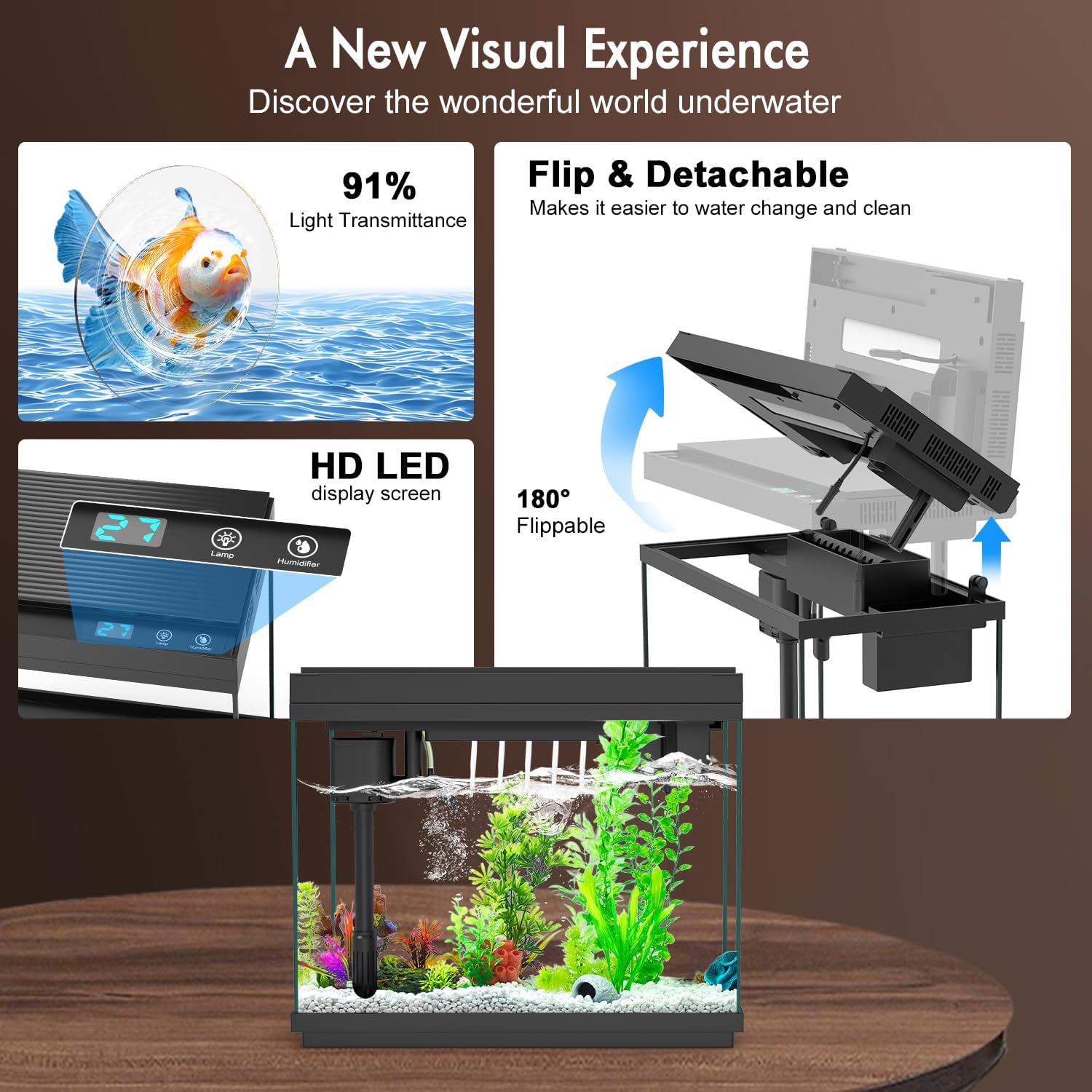 About this item 🐠The Rechale smart aquarium features a transparent glass design for clear viewing and enhanced light penetration, showcasing your aquatic world beautifully. Includes 3 filter sponges for effective water purification, ensuring a clean and healthy habitat for your fish. 🐠Temperature Display and 3-Level Humidifier: Equipped with a temperature display and 3-level humidifier, this all-in-one aquarium ensures the perfect conditions for your fish, making it ideal for both saltwater and freshwater setups. 🐠Silent Operation: Enjoy a peaceful aquatic experience with the silent operation of the 3-in-1 pump, which provides self-circulating oxygenation, ensuring a healthy and quiet environment for your fish. 🐠7-Color LED Mood Lighting: Customize your space with vibrant 7-color rotating LEDs or select a fixed hue to match your decor. Features adjustable brightness and automatic timer settings (4/8/12 hours) for energy-saving convenience. 🐠Easy Setup & Versatile Use: Effortlessly assemble and maintain with a user-friendly design. Compact and stylish, it’s ideal for desks, nightstands, living rooms, or offices. Makes a unique gift for fish lovers, aromatherapy enthusiasts, or home decorators! 🐠Smart Touch Control: Manage lights, temperature, and misting functions with the intuitive smart touch control, providing you with easy and precise control over your aquarium's settings. 🐠Convenient Feeding Access: The top of the tank features a flip-top feeding port, making it easy to feed your fish without disturbing their habitat, ensuring a stress-free feeding experience. 🐠Compact and Stylish: It is designed to fit perfectly into any home or office space, with a sleek and modern appearance that complements any decor. Its compact size (30CM14.8CM24.2CM) and 9L capacity make it an ideal choice for fish enthusiasts. 🎁【Perfect Gift】Making it an ideal Christmas gift for friends, family, or yourself. If you have any questions, please feel free to contact us, and we will reply you within 24 hours! Show more › See more product details
