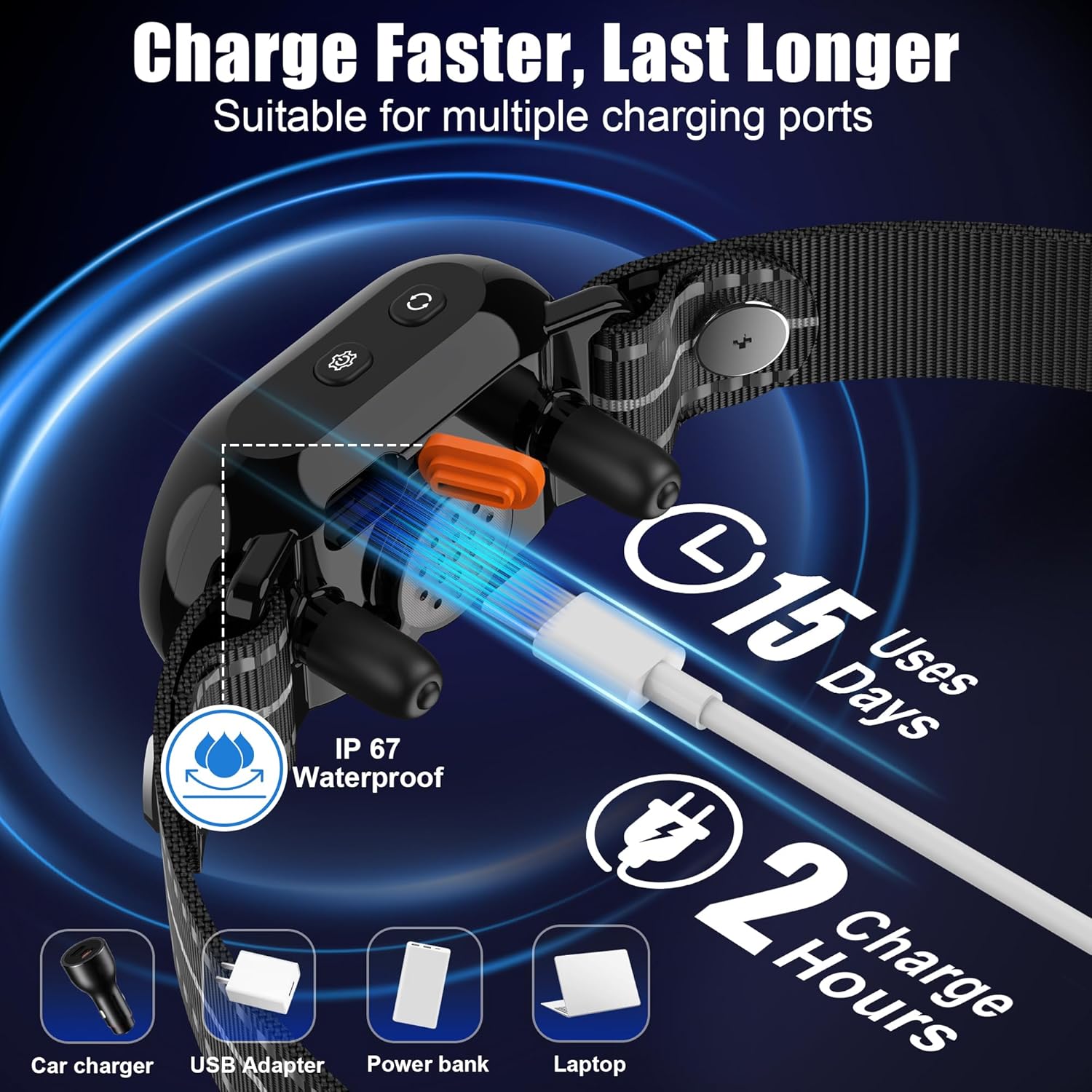 About this item Upgraded Smart Detection & Humane Training:Equipped with an advanced smart chip, this bark collar accurately detects your dog's barking while minimizing false triggers from other noises. It offers multiple humane correction modes to suit your dog's temperament and ensure effective, stress-free training.Precisely control what the device reacts to. From low sensitivity for loud, persistent barking only, to high sensitivity for softer yaps. This prevents false triggers from other noises, ensuring the correction is only for your dog's barking. Safety-First Protection & Automatic Operation:Your pet's comfort is our priority. The barking collar features an automatic safety pause that deactivates for about one minute after several consecutive corrections, preventing overstimulation. Just turn it on and let it work automatically to manage barking day or night, ensuring peace for you and your neighbors.Whether your dog has a sharp yap or a deep bark, you can set the sensitivity to match their volume and your environment, so corrections happen only when needed . Easy-to-Use Customization for Your Dog:Tailor the training to your dog's needs easily. Adjustable sensitivity levels (up to 5 levels) and independent mode controls allow you to find the perfect setting for your dog's barking habit and your home environment. Choose the most suitable method for your dog's learning style. Options include Beep, Vibration,Beep+Vibration,static, beep+vibration, beep+vibration+static mode.An intuitive LED screen clearly displays the mode, sensitivity, and battery status. Comfortable All-Size Fit & IP67 Waterproof:Designed for all-day comfort, the adjustable strap (fits neck sizes 6-25 inches) suits small, medium, and large dogs (8-150 lbs). The durable, skin-friendly nylon and IP67 waterproof rating allow your dog to play, swim, or bathe without worry. Long-Lasting Battery & Rapid Charging:Never worry about frequent charging. This anti barking device with a powerful rechargeable battery, a single charge (taking only 2 hours) supports up to 7-15days of continuous use, perfect for busy pet parents. › See more product details