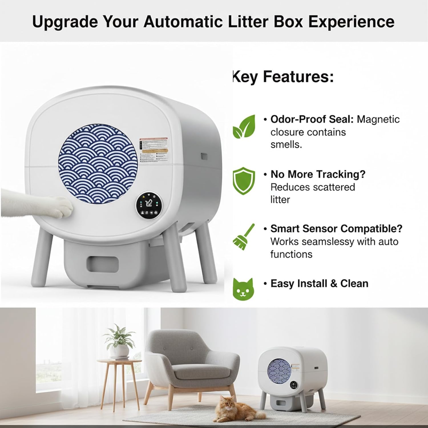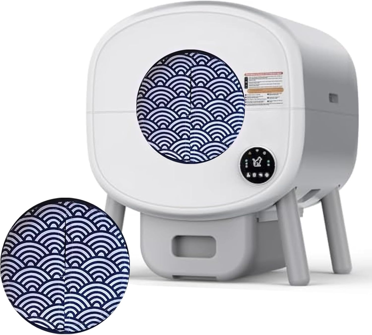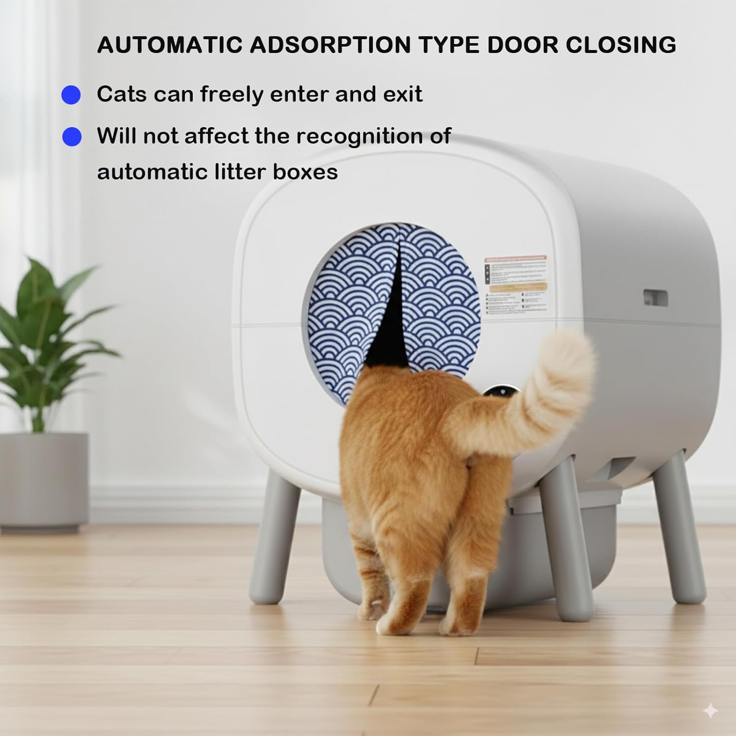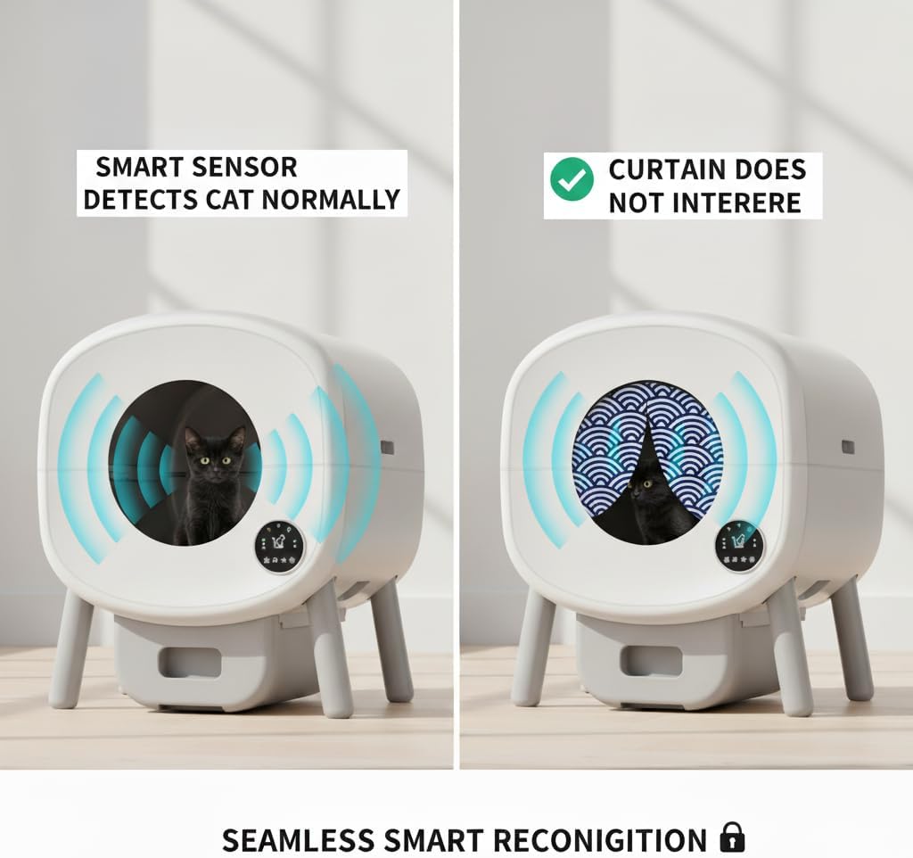 Upgrade Your Cat Litter Box Experience with Our Smart Privacy Door!Transform your home environment and enhance your cat's litter box experience with our revolutionary Cat Litter Box Privacy Door. Designed specifically for all litter boxes with circular openings under 10.2 inches in diameter, this innovative accessory brings a new level of cleanliness, odor control, and convenience to your home.Why Choose This Smart Litter Box Privacy Door?Superior Odor Control: Our high-density, waterproof fabric curtain, coupled with an automatic magnetic closure, creates an effective barrier against unpleasant odors. Enjoy fresh air and a more inviting home, free from lingering smells.Drastically Reduces Litter Tracking: The auto-closing door helps to contain litter within the box, significantly minimizing the amount of litter tracked onto your floors. Spend less time cleaning and more time enjoying your pristine home.Uninterrupted Smart Functionality: Worried about compatibility? Our privacy door is engineered to allow your automatic litter box's smart sensors to detect your cat normally. Your litter box will continue to operate seamlessly, providing all the automated benefits you love.Simple & Quick Installation: Forget complicated setups! With our easy-to-follow 3-step installation, you can have your new privacy door ready in moments. We provide durable adhesive Velcro strips for a secure and symmetrical fit.Durable & Hygienic Design: Made from premium, stain-resistant waterproof fabric, this door is built to last and easy to maintain. Its charming cat motif adds a touch of style, ensuring it looks great in any room.A Happier Home for You & Your Cat: Provide your cat with a private and secure space, reducing stress while improving hygiene for both of you. Experience stress-free, clean living with fresh air and a mess-free environment.Product Specifications:Compatibility: Fits circular litter box openings with a diameter less than 10.2 inches.Material: High-density, waterproof fabric with magnetic closure.Features: Auto-close, odor-blocking, stain-resistant, smart sensor compatible.