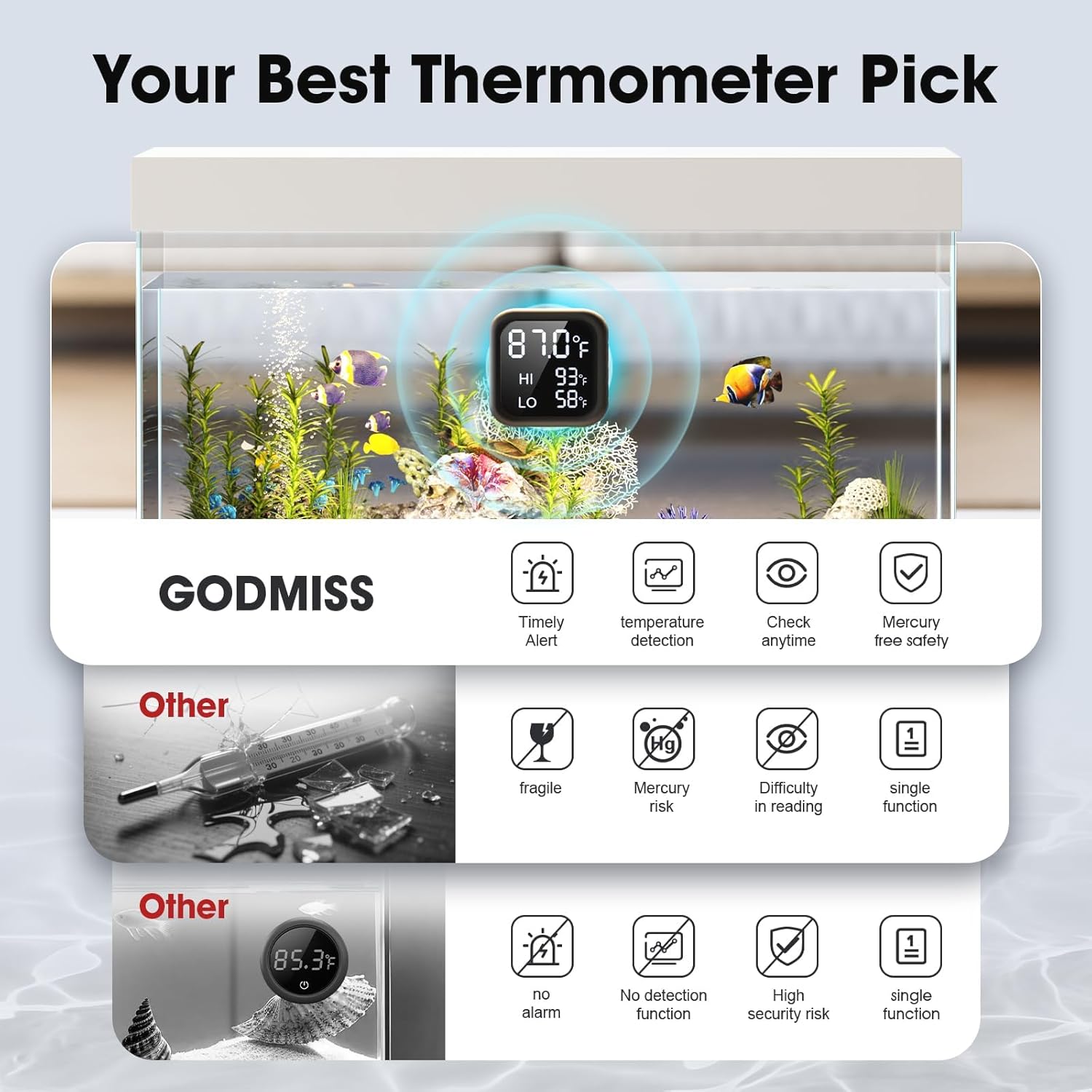 About this item 𝐁𝐫𝐢𝐠𝐡𝐭 𝐋𝐄𝐃 𝐃𝐢𝐬𝐩𝐥𝐚𝐲 𝐰𝐢𝐭𝐡 𝐈𝐧𝐬𝐭𝐚𝐧𝐭 𝐀𝐥𝐚𝐫𝐦:This aquarium thermometer features a high-contrast LED display with a wide viewing angle, ensuring clear readability in all lighting conditions. Customizable HI/LO thresholds (0-80°F) allow you to set your desired temperature limits. When the temperature exceeds the set limit, a rapid flashing alert is triggered, prompting immediate heating/cooling adjustments to protect aquatic life.Ideal Christmas gifts or stocking stuffer! 𝐋𝐨𝐧𝐠-𝐋𝐚𝐬𝐭𝐢𝐧𝐠 𝐁𝐚𝐭𝐭𝐞𝐫𝐲 & 𝐕𝐞𝐫𝐬𝐚𝐭𝐢𝐥𝐞 𝐔𝐬𝐞:Equipped with a pre-installed 3V battery for extended operation, eliminating the hassle of frequent replacements. Suitable for various water types including fresh water, salt water, tap water, and sea water. Its compact design seamlessly integrates with aquarium decorations, combining functionality with aesthetics. 𝐖𝐢𝐫𝐞𝐥𝐞𝐬𝐬 𝐓𝐨𝐮𝐜𝐡-𝐒𝐞𝐧𝐬𝐢𝐭𝐢𝐯𝐞 𝐃𝐞𝐬𝐢𝐠𝐧:The cable-free design keeps the fish tank clean. The power button integrates the long press to turn on/off and short press to adjust the temperature function: Long press for 1 second to start/stop, short press for 0.5 seconds to enter the setting mode. When in operation, short press directly adjusts the HI/LO threshold. It automatically enters sleep mode to save power after 10 seconds of no operation. 𝐏𝐫𝐨𝐟𝐞𝐬𝐬𝐢𝐨𝐧𝐚𝐥-𝐆𝐫𝐚𝐝𝐞 𝐀𝐜𝐜𝐮𝐫𝐚𝐜𝐲:Double calibrated in the laboratory, the measurement error is strictly controlled within ±0.9℉. The reading is updated every 30 seconds, allowing you to immediately detect subtle temperature changes and provide a stable living environment for temperature-sensitive aquatic plants, salamanders, etc. 𝐀𝐥𝐥-𝐢𝐧𝐜𝐥𝐮𝐬𝐢𝐯𝐞 𝐚𝐧𝐝 𝐫𝐞𝐥𝐢𝐚𝐛𝐥𝐞 𝐬𝐮𝐩𝐩𝐨𝐫𝐭:Includes 1 aquarium thermometer, 1 pre-installed battery, and 2 reusable adhesive pads. For installation, performance, or compatibility questions, our professional customer service team offers dedicated assistance to ensure seamless operation. › See more product details
