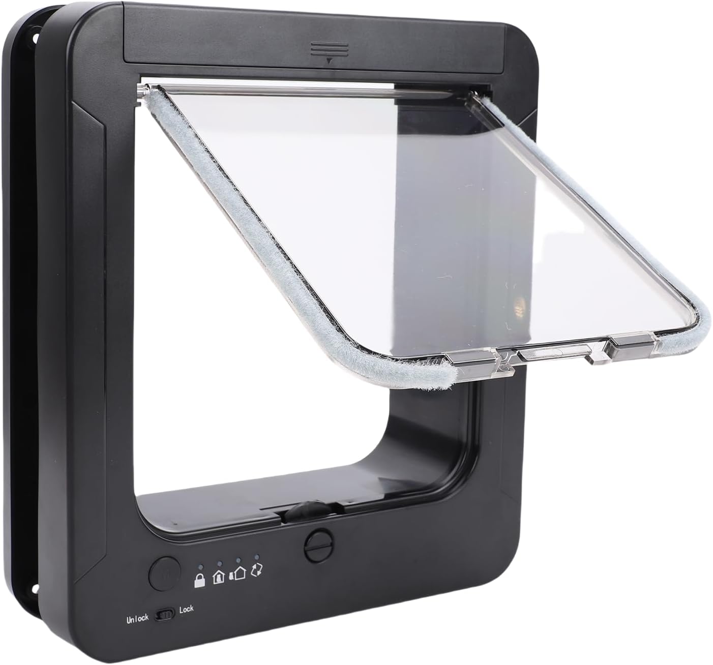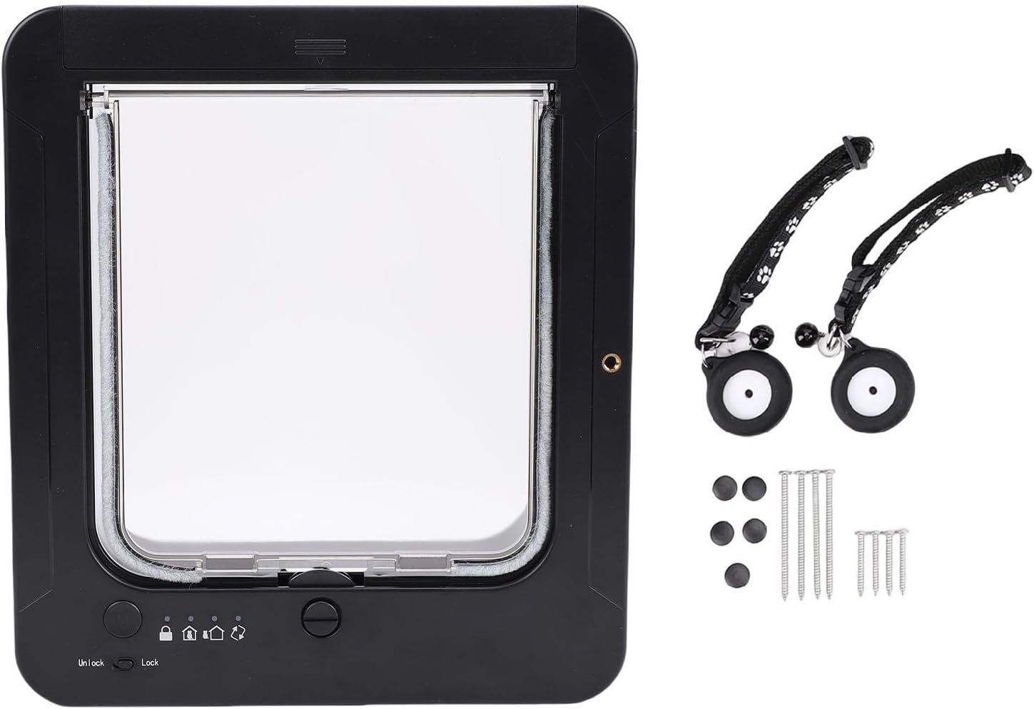 1. : The smart cat door utilizes advanced sensing technology to automatically identify your pet's identity and manage their entry and exit direction, ensuring seamless navigation for your furry friend. 2. : Support for 2 way entry methods, this pet door allows your pets to move indoors and outdoors, offering them the flexibility and convenience they deserve for their daily activities. 3. : The kit comes with collar that activates the door, allowing for quick and effortless management of your pets, ensuring they can come and go with ease while you maintain control. 4. : Equipped with multiple safety guard mechanisms, this smart cat door guarantees the security of your pets as they come and go, providing peace of mind for pet owners at all times. 5. : Crafted from high grade plastic materials, the smart pet door is not only built to withstand daily use but is also easy to clean, ensuring it remains a practical addition to your home for years to come. Spec: Item Type: Smart Pet Door Material: Plastic Size: Approx. 26x29.5cm / 10.24x11.61in Battery Type: AA Battery x4 (Batteries Not Included) How to Use: Simply assemble and install the battery to start using. PackageList: 1 x Pet Door 2 x Collar 8 x Screws 1 x Instruction Manual 5 x Accessories