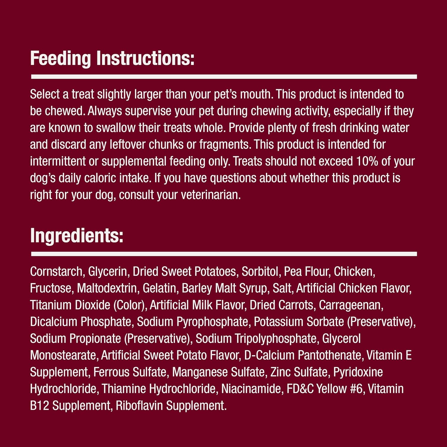 SmartBones® SmartSticks® with real sweet potato are made with chicken and wholesome vegetables for a scrumptious taste dogs can’t resist. These stick-shaped treats have a vegetable outside wrapped around real sweet potatoes and chicken inside. A healthy alternative to rawhide, these vitamin and mineral enriched chews are easy to digest while still satisfying your dog’s natural urge to chew. Chewing helps maintain healthy teeth. Giving your dog a treat that you both love just got a whole lot easier! Contains 12 chews. Feed your dog 1 to 2 chews per day. Always supervise your pup during chewing activity. These chews are for intermittent or supplemental feeding only. Select a chew slightly larger than your pet’s mouth. Discard chunks or fragments. Always provide plenty of fresh drinking water and visit your veterinarian regularly. Store in a cool, dry place. After opening, reseal or store in an airtight container to preserve freshness.