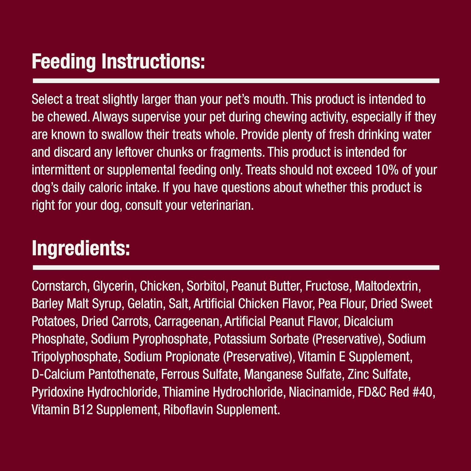 - Care Instructions: Always supervise your pet during chewing activity. This product is intended for intermittent or supplemental feeding only.