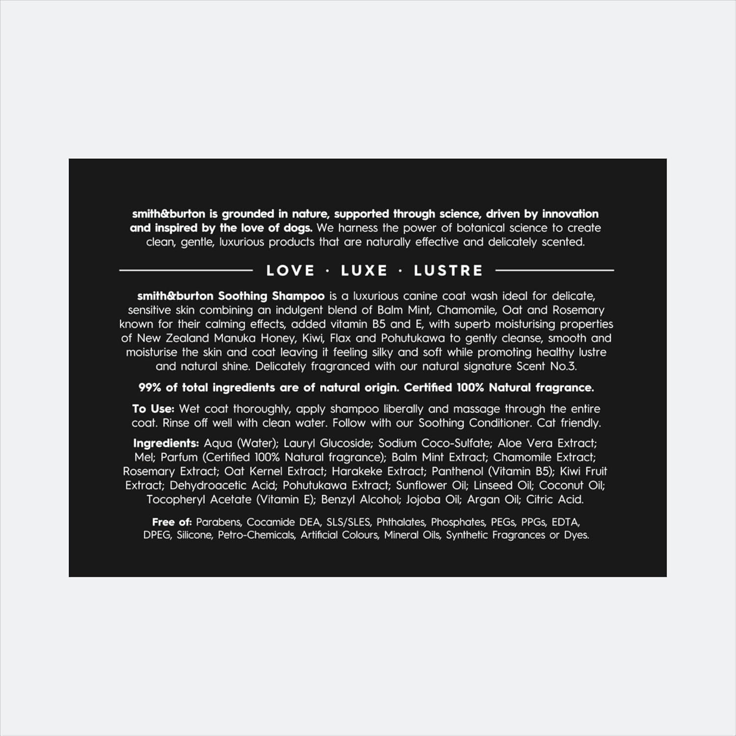 smith&burton Soothing Duo Set is a gentle, calming two-step grooming ritual crafted for dogs and cats with delicate or easily-reactive skin. This luxurious pair — Soothing Shampoo and Soothing Conditioner — blends Balm Mint, Chamomile, Oat, Rosemary and Manuka Honey to comfort the skin while softening and refreshing the coat with natural lustre and shine.Designed for mature coats, smooth coats and sensitive companions of all ages, the formulas cleanse and condition without stripping the skin’s natural balance. Each wash brings a sense of ease, helping the coat feel nourished, soothed and touchably soft.Infused with our natural signature Scent No.3, the experience is gentle and serene — a soft floral-herbal aroma crafted to respect your dog’s sense of smell while adding a light, elegant finish between baths.Proudly crafted in New Zealand, every bottle reflects smith&burton’s philosophy of pure, mindful care. Plant-based, cruelty-free, pH balanced and enriched with antioxidant-rich botanicals, this duo transforms routine grooming into a moment of comfort, connection and quiet luxury for your pet.