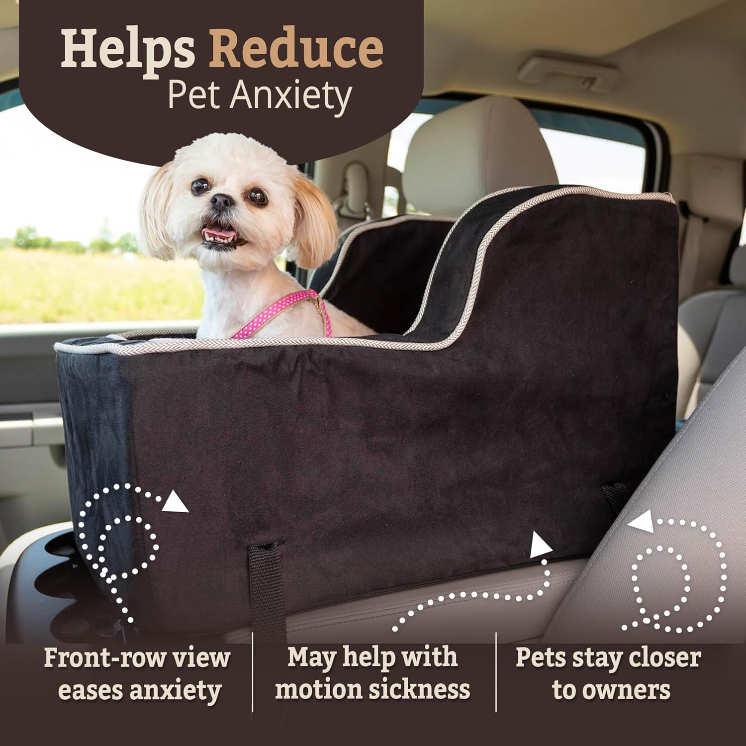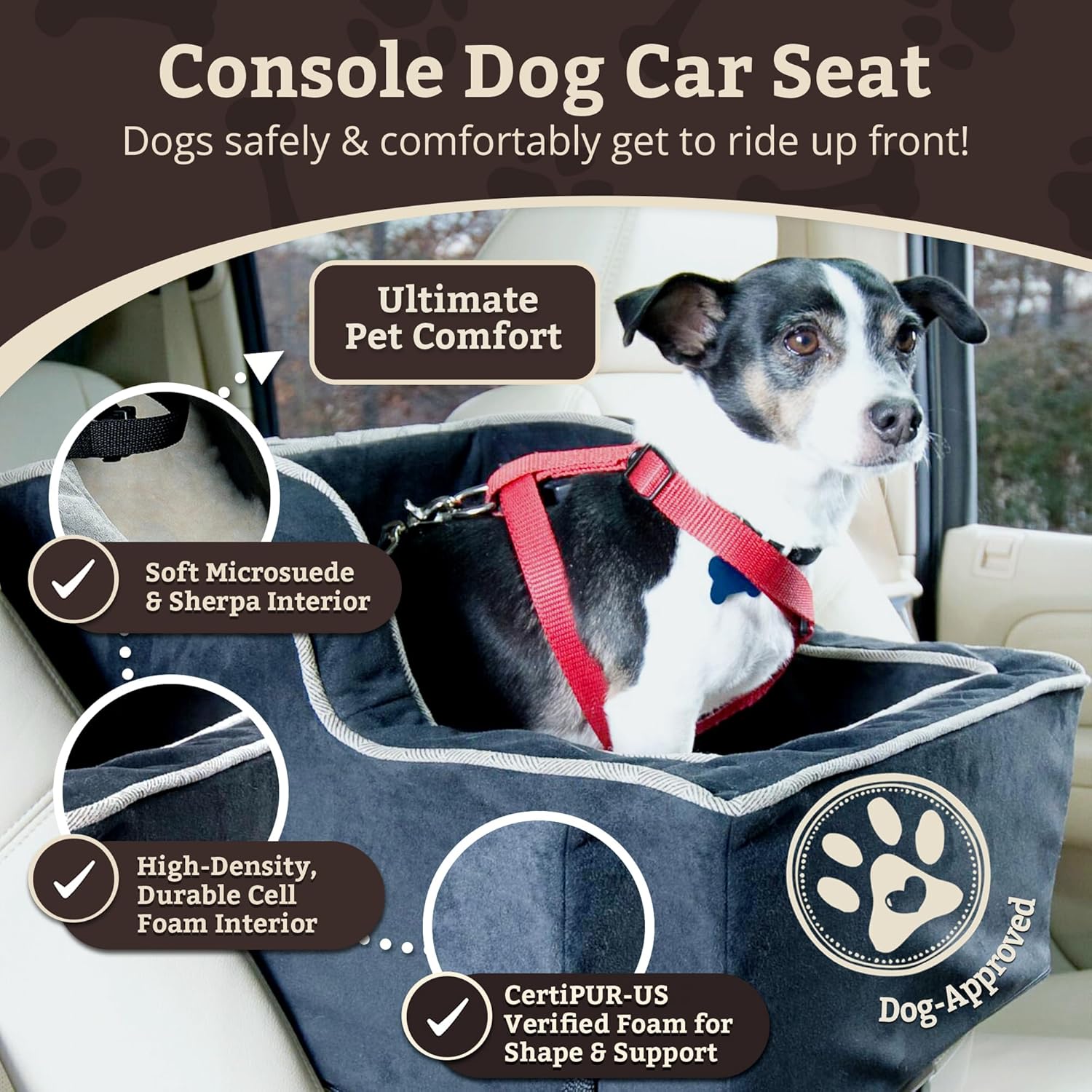 About this item Luxurious Dog Car Seat: The High-Back Console Dog Car Seat is a comfortable & secure car seat for small and medium size dogs up to 12 pounds; the perfect booster seat for pups to see out of the window For Calmer, Happier Dogs: Our middle console dog car seat has a slightly raised bed, allowing dogs to easily see out the window, helping them to be happier and calmer during long or short drives Designed for Safety and Comfort: This dog console car seat for small dogs attaches safely to your vehicle's console and has an internal strap to keep your dog from wandering around while you drive Comfortable and Easy to Wash: Our car seat for dogs is exceptionally durable, washable, and resistant to fading, water, and even playful wear and tear. It has a soft removable cover for easy washing Made-to-Order in the USA: This pet booster seat is handcrafted right here in the USA. This dog car seat measures 12H x 12W x 20L and is designed to fit large truck and SUV center consoles › See more product details