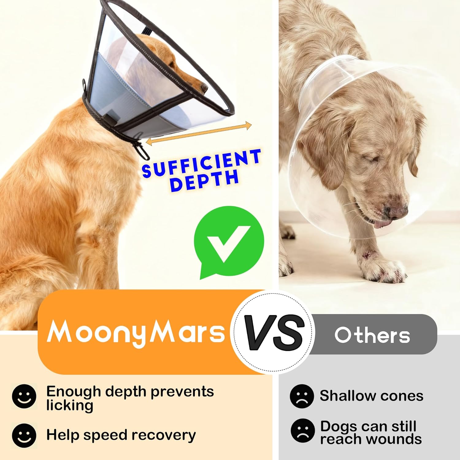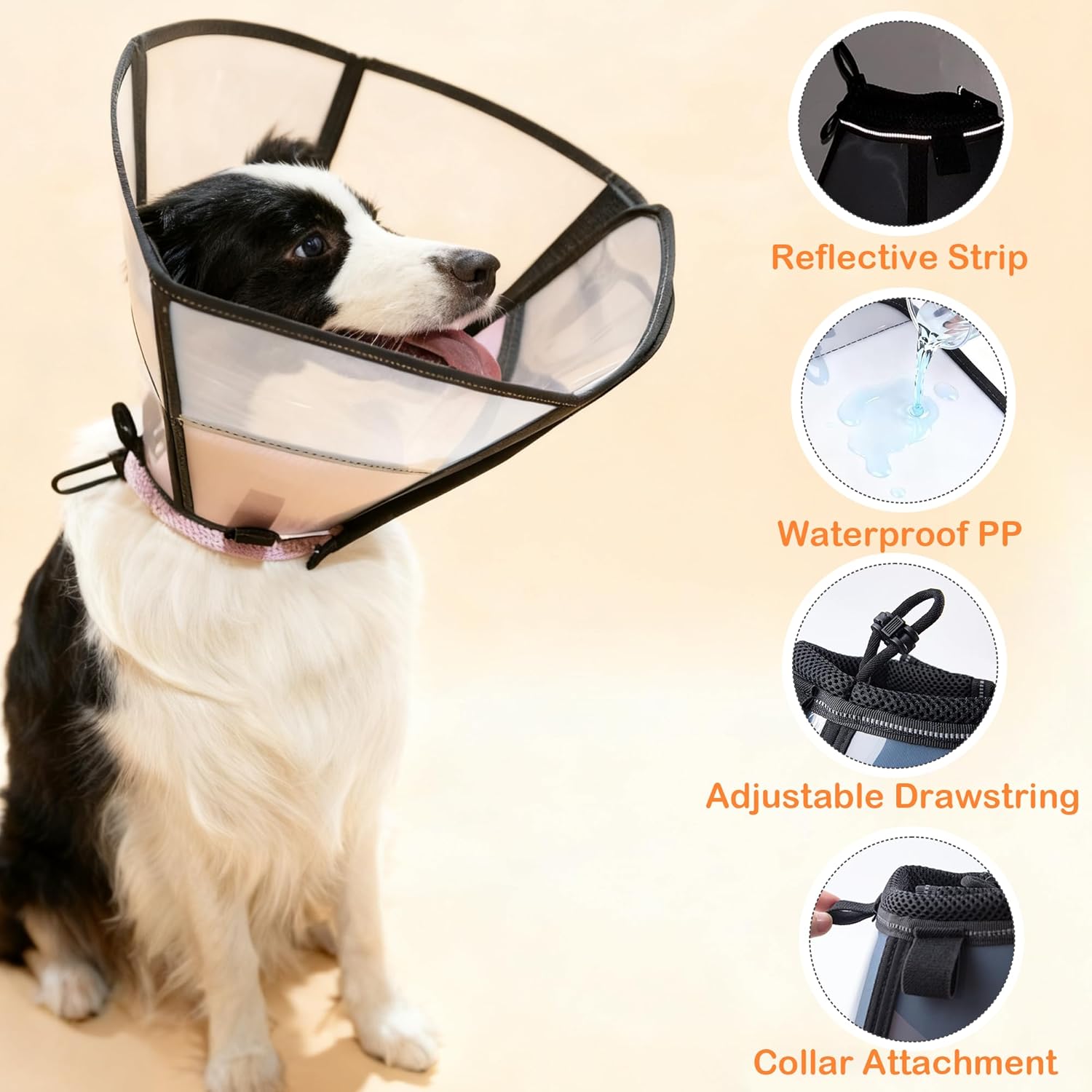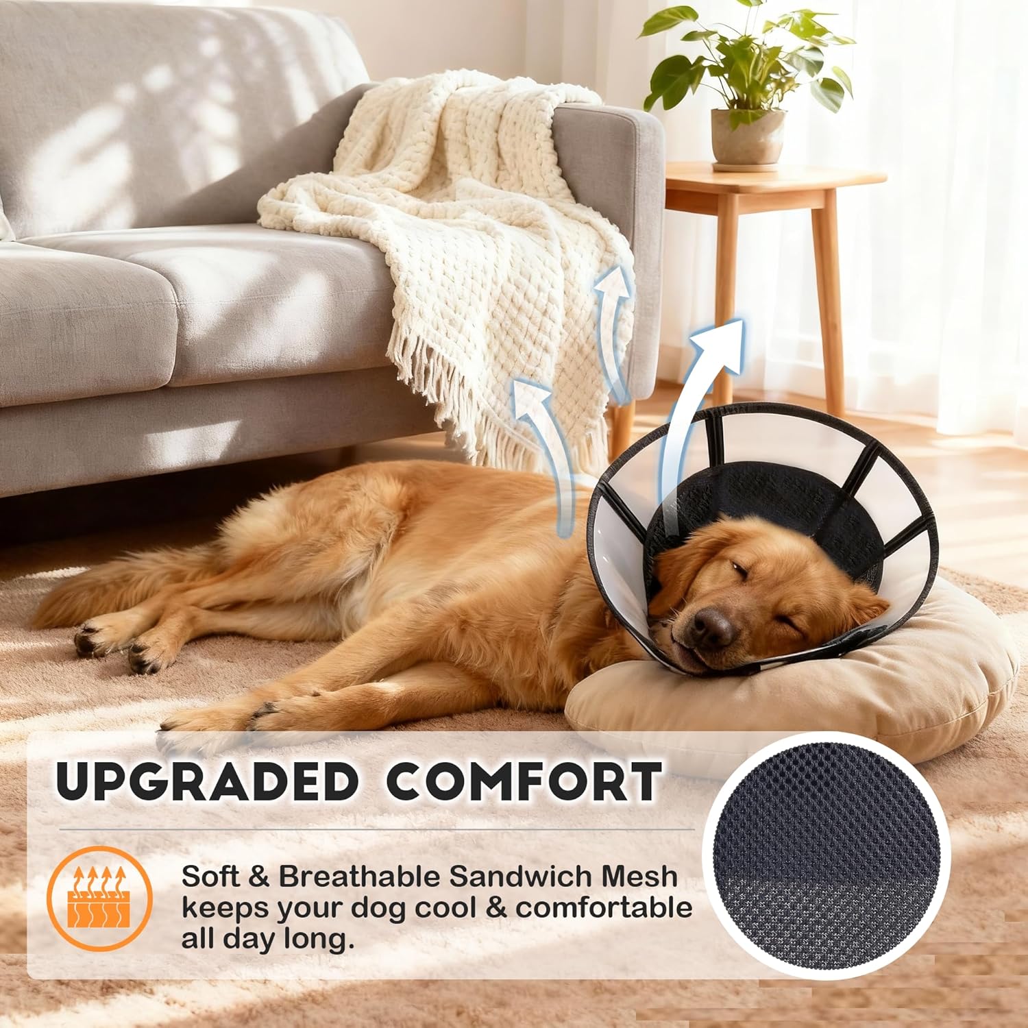 About this item No licking & Perfect Fit(Measure First!) - We offer M(Neck:13-15.75", Depth:7.75"), ML(Neck:13-15.75", Depth:11"), L(Neck:14.25-18", Depth:10"), LL(Neck:14.25-18", Depth:12"), XL(Neck:18-23.25", Depth:12.25"), XXL(Neck:22-27.5", Depth:14.5") from medium to giant size to fit breeds like French Bulldog, Beagle, Labrador, Golden Retriver, Australian Shepherd, Great Dane, German Shepherd, and so on. ***Crucial: Measure your dog's snout length & neck circumference before ordering this soft dog cone. Upgraded Comfort - Treat your furry baby to cloud-like comfort! The double-layered design of the elizabethan collar features super soft & breathable mesh, especially around the crucial neck area. No itching or irritation – just happy, relaxed wear. Clear Vision & Easy Clean - Keep adventures safe with unobstructed sightlines. The durable transparent outer PP material of this soft dog cone prevents trips and bumps while allowing natural movement. Plus, its waterproof surface wipes clean in seconds – perfect for messy mealtimes or outdoor fun. Secure, Effortless & Adjustable Fit - Generous strong-hold Velcro ensures a secure base, while the adjustable drawstring of this dog recovery cone tailors the size precisely. ***Bonus Velcro patches included for an even snugger, customized fit if needed. Thoughtful Details for Convenience & Safety - Features include a convenient collar attachment loop, reflective thread for low-light safety, and a collapsible design making storage a breeze. This dog surgical cone is designed with your dog's ease in mind! › See more product details