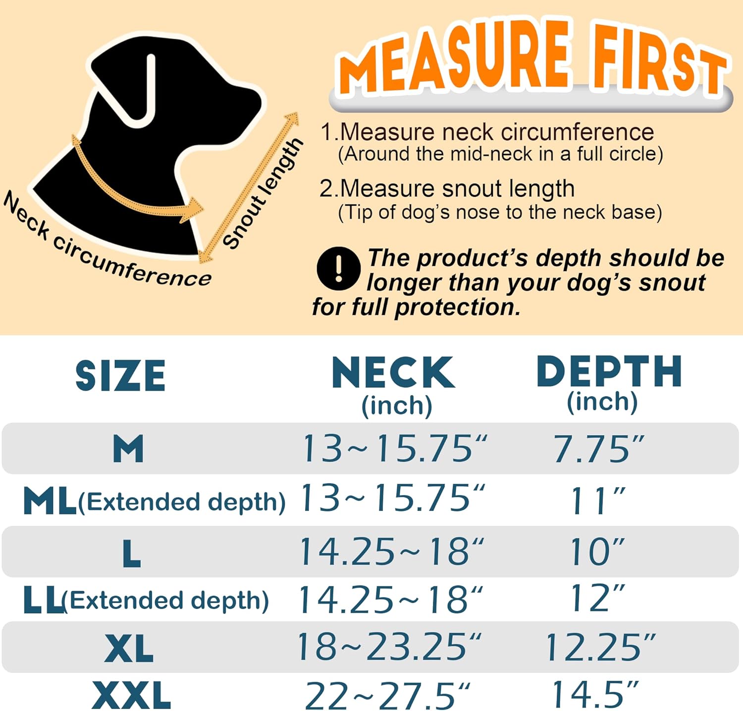 - Directions: Measure first before ordering. Ensure the soft dog cone is deeper than your dog’s snout to stop licking—especially if the injury is on legs or tail, or your dog has a long snout.