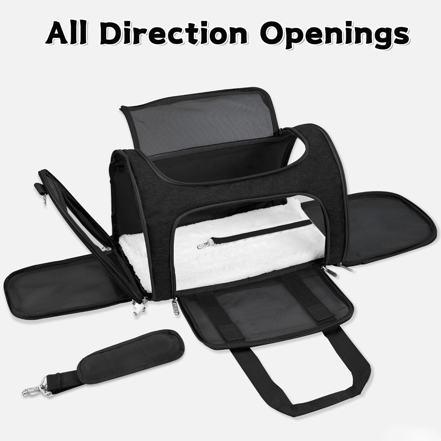 About this item High Quality Design:Sturdy steel cage structure and wooden support board maintain good spatial stability and shape. Breathable mesh windows on four sides,which can ensure good air circulation and views,make pets have a comfortable and safe travel.It can also be easy for you to check on your pets.There is a front pocket to store pet toys,treats,etc. Dimension and Weight:Made of durable tear-resistant fabric.Four easy entrances for pets. Dimensions: 17 inch x 11 inch x 11 inch (L*W*H), suitable for pets up to 16 lbs.Please don't choose your carrier based on weight only,consider your pet's length and height when choosing a carrier. Airline Approved & Safty:Can be placed under the seats of most airplanes(Four non-slip feet on the bottom to prevent movement), and comfortably on the seat next to you in a car or bus.It has a adjustable shoulder strap.Can also be fastened to the car seat with a safety belt or shoulder strap to keep your pet safe. Easy to Clean :You can clean the stains and dirt on the surface with a soft cloth.Soft mat inside the pet carrier is removable and washable.You can take it out and wash it easily to solve all stains. Easy to Collapsible & Lightweight:When not in use,fold it into a flat,space saving and easy to store.Only 2.2lbs,it's easier to carry around.It can also used as a toy of pet house,allowing pets to play in a safe space to relax and rest. › See more product details
