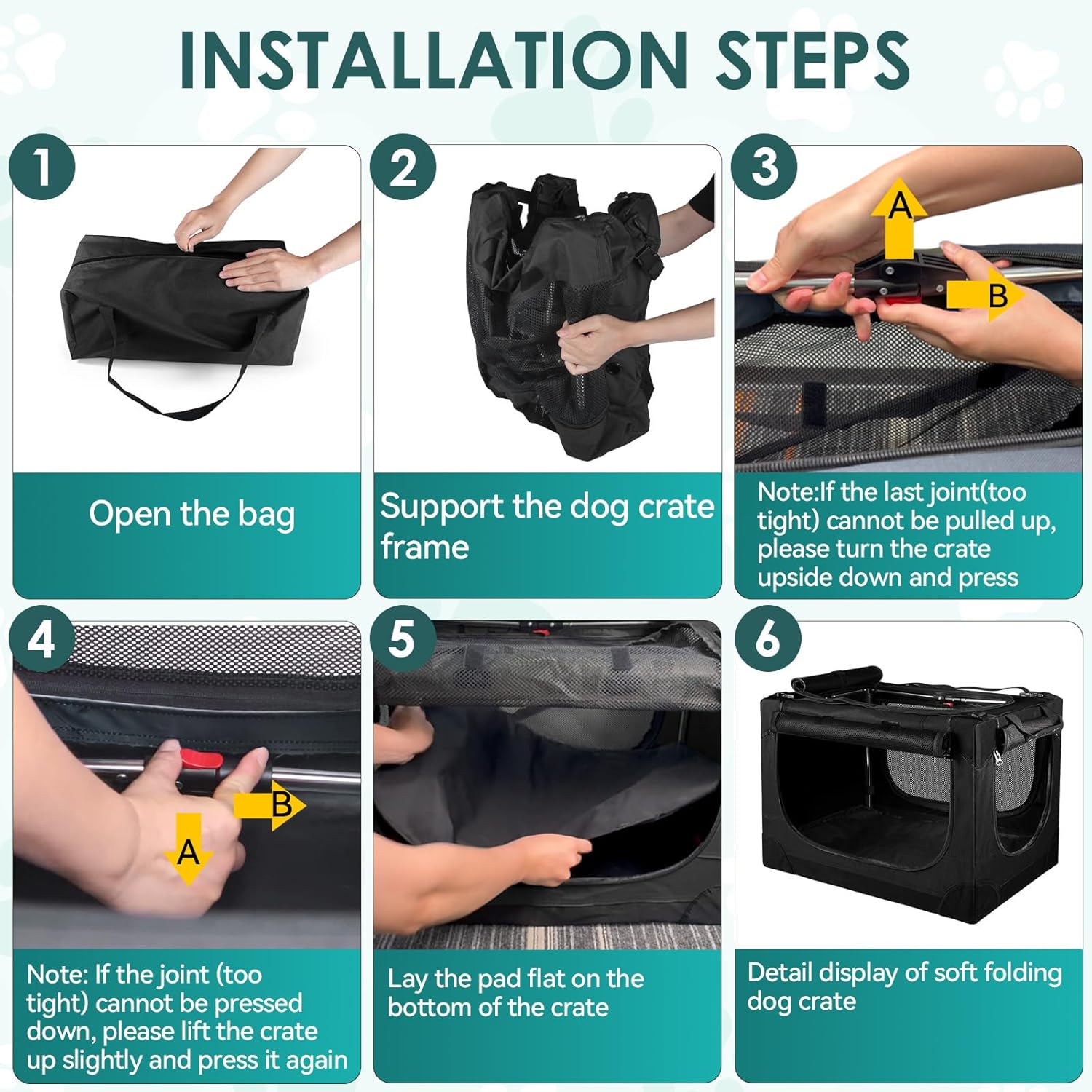 About this item 【Portable & Space-Saving】Lightweight yet sturdy foldable design makes this soft collapsible dog crate perfect for outdoor, travel, camping, or home use. This portable travel dog crate can be folded and stored in just a few seconds, saving space and making it perfect for placing in your trunk or any corner of your home 【Maximum Ventilated & View】The foldable pet crate frame is constructed from sturdy steel tubing, while the crate cover is made of high-quality 600D fabric and anti-bite mesh fabric. This makes a well-ventilated, stylish, and lightweight crate that provides a comfortable and secure environment for your dog. Features FOUR mesh doors for airflow and clear visibility, keeping your pet comfortable and allowing you to easily check on them 【Ideal Size for Small Pets】Measuring 24"(L) x 17"(W) x 17"(H), this portable dog kennel comfortably accommodates small dog breeds. This dog car carrier can hold a maximum of 35 pounds of pets. The spacious interior provides a comfortable and secure environment, making it suitable for puppies, cats, or as a convenient travel den during car rides, visits, or overnight stays 【Convenient Built-in Accessories】The puppy crates for small dogs enjoy added practicality with the built-in safety leash, storage pouch for toys or treats, and the soft, removable cushion mat provides a cozy resting spot, ensuring your pet feels relaxed and secure whether at home, in the car, or outdoors. Double zipper closures on doors ensure security and prevent clever escapes 【Quick Assembly & Storage】The soft travel cage for dogs is fully assembled and can be set up and folded down in seconds, without requiring any tools. Its waterproof fabric and detachable washable mat keep your pet dry and cozy while resisting spills, mud, and moisture. To save you the inconvenience of returning the crate, we kindly urge you to measure your dog accurately. Ensure that the green dog crate is the right fit for your beloved pet › See more product details