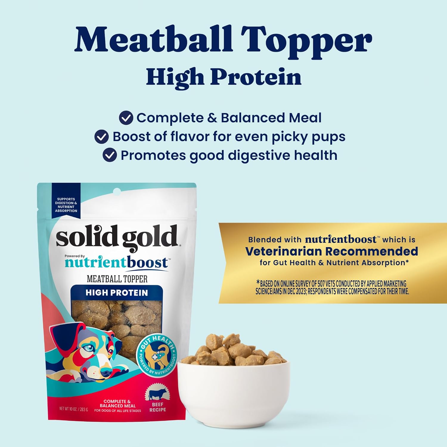 About this item Protein-Packed Dog Food Topper – Solid Gold NutrientBoost Meatball Topper is a tasty, high-protein dog food topper, meal mixer & treat made with real beef & superfoods. Use as dog food toppers for picky eaters or treat for dogs of all ages & sizes Made with Real Beef – With savory, protein-packed beef & Nutrientboost, this kibble topper for dogs is perfect for picky eaters or pups needing extra fuel for their day. A great nutrient-rich topper alternative to freeze dried dog food toppers Powered by NutrientBoost Plasma – Made with plasma, a source of amino acids, antibodies & proteins to help support digestion, immunity & nutrient absorption—ideal for dogs needing functional toppers, a dog food flavor enhancer or gut support Supports Gut & Immune Health – This grain-free & gluten-free dog meal topper has a blend of vitamins, minerals & superfood ingredients to support healthy digestion & a strong immune system—great for sensitive stomachs & an appetite booster for dogs Versatile Dog Food Toppers for Picky Eaters – Serve as a dog food mix-in, a protein packed topper for dry or wet food, or a functional treat. This tasty dog food additive adds flavor, texture & nutrition to any bowl—perfect puppies & picky eaters › See more product details