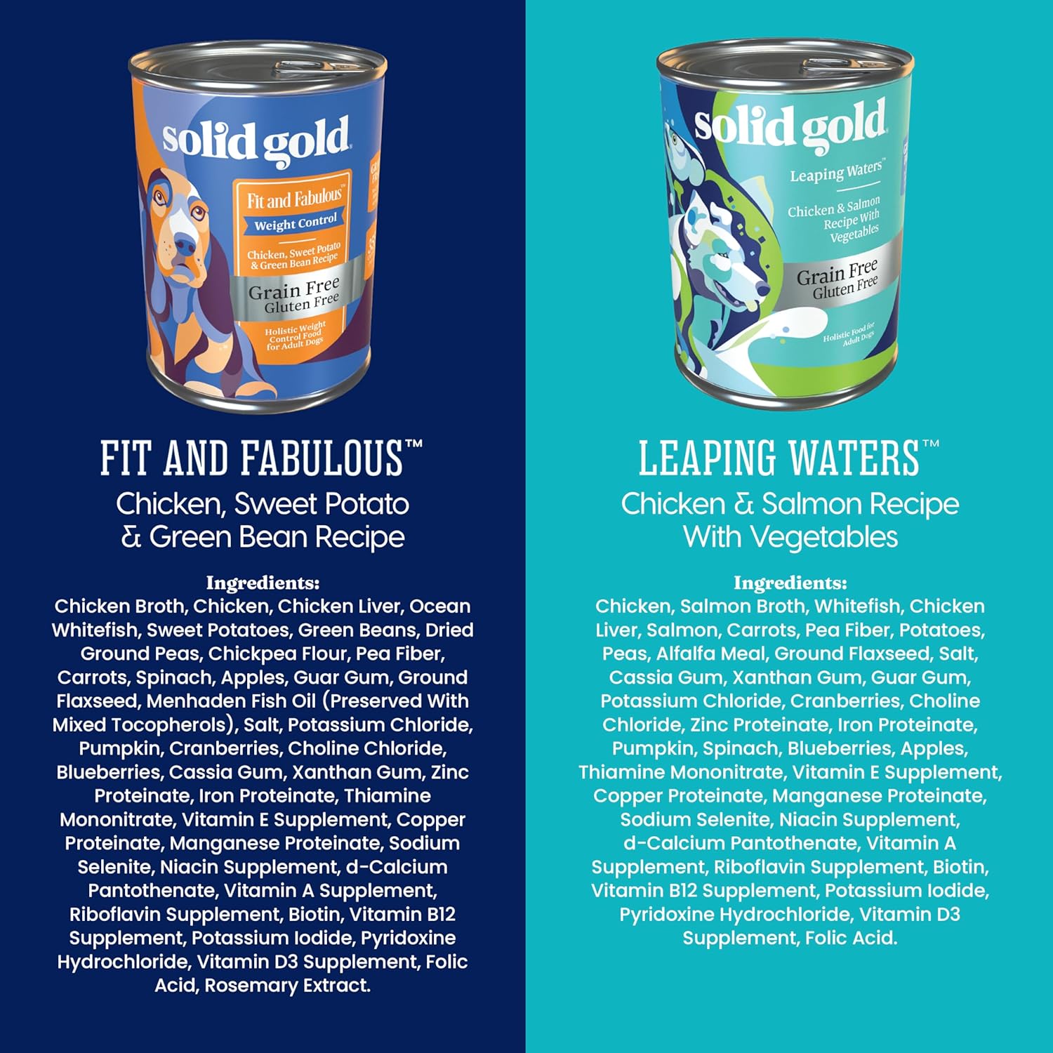 About this item Make Your Dog Leap for Something Fab! - Solid Gold Fit and Fabulous weight control dog food and Leaping Waters sensitive stomach dog food are grain free dog foods that supports gut, immune, skin, and coat health for any adult breed The Best Quality Ingredients - Loaded with superfood, antioxidants, and omega fatty acids that can support skin, coat, and immune system health for pet dogs of small, medium, or large sizes. Premium Weight Control - The Fit & Fabulous low fat, low calorie recipe is made with real chicken for a lean, nutrient rich source of protein that keeps calories and fat lower to support a healthy weight. Full-Body Health - Leaping Waters contains a balance of omega fatty acids and probiotics to enhance your dog's coat and support immune health, along with wholesome vegetables & superfoods that provide fiber and vitamins to aid digestion Convenient and Easy to Serve - Serve alone to give your dog a nutritionally complete and balanced meal, or serve as a meal topper or mixer along with our Solid Gold dry dog food products › See more product details