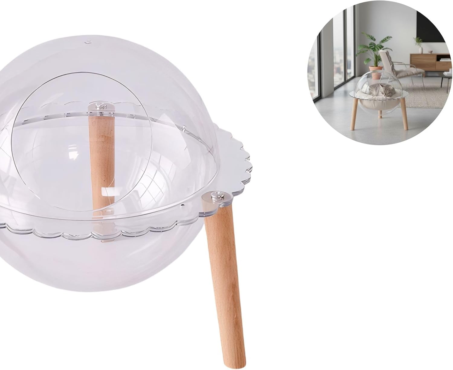 This space capsule-style cat house features a made of food-grade PET material, offering a secure, stable, and comfortable retreat for indoor cats. The semi-enclosed design provides both security and visibility, supporting feline behavior. Supported by sturdy wooden legs, it elevates the bed slightly to keep pets off cold floors while enhancing air circulation. With overall of 38 x 30 x 20 cm and a 15 cm diameter wide entrance, this modern cat bed fits perfectly in contemporary home environments such as living rooms, bedrooms, or sunrooms. Designed for cat owners who aesthetic appeal and functional pet spaces, this cat house blends effortlessly into modern decor while giving cats a private, cozy.