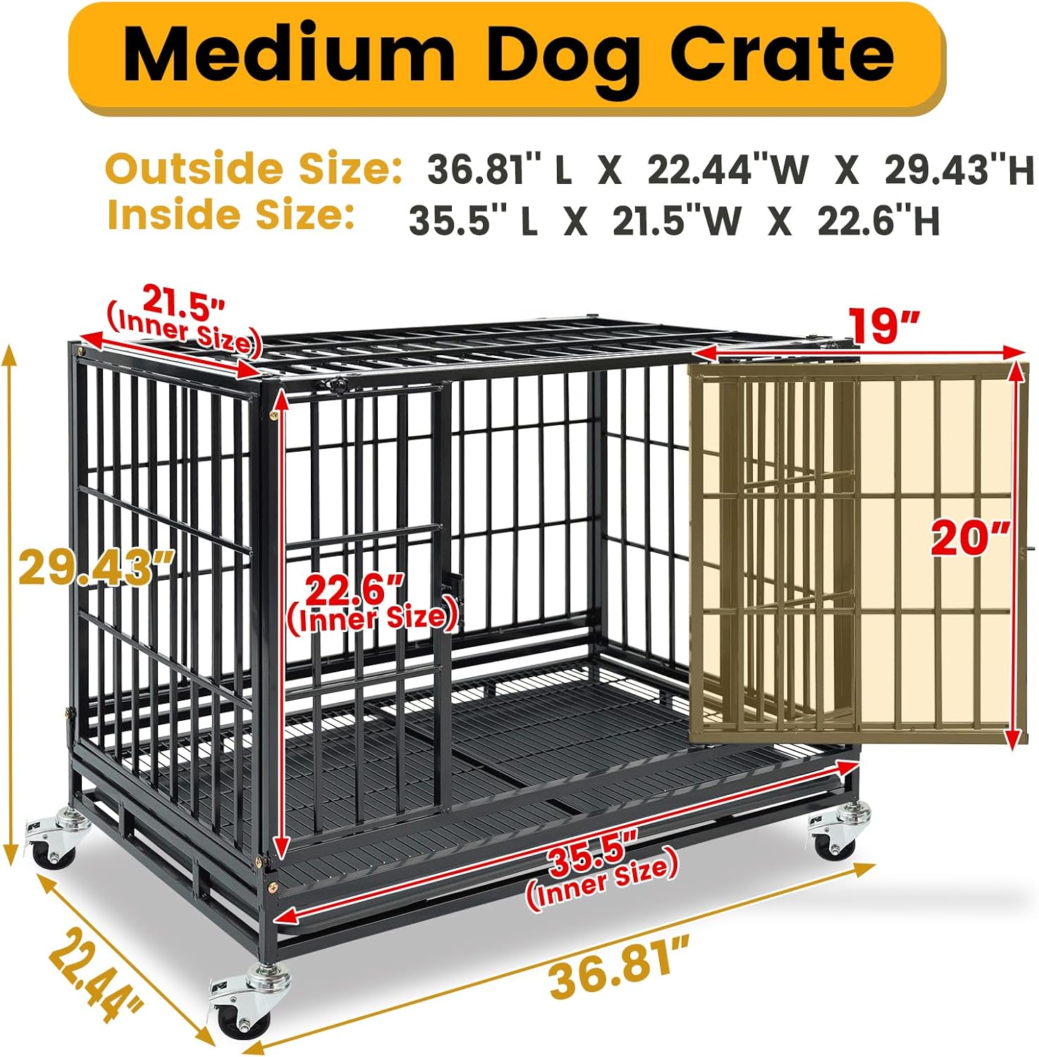 About this item Stackable and Portable Dog Crate: This dog crate for medium dogs can be stacked vertically up to three levels, saving you 66.6% of space. The foldable design and pre-installtion allow for quick setup and compact storage, making it a highly portable pet cage Durable Heavy Duty Dog Cage: Built with a strong 0.32 inch thick square tube frame, the metal dog crate delivers exceptional strength and durability. It is more robust than ordinary wire dog crates, providing a secure and long lasting solution for energetic or anxious dogs that need a dependable indoor kennel Effortless Mobility: The 36 inch dog crate with 4 lockable and removable wheels, you can easily reposition the dog cage without breaking a sweat. Whether you're cleaning, rearranging, or moving the crate between rooms, the smooth, hassle-free wheels ensure you can do it all, while the wheels locking mechanism keeps it stable and secure Dog Crates for Medium Dogs: This dog cage medium sized dogs offers a spacious interior, measuring 35.5"L x 21.5"W x 22.6"H. It is the perfect indoor dog kennel for medium dogs like Corgis, Dachshunds and French Bulldogs. The secure space offers ample room for comfort and safety, making it an ideal pet crate for your dog Double Security: The escape proof dog crate has a double security feature where the auto-lock when closed, plus there's an extra carabiner for added security. Escape proof design eases your dogs anxiety. The top door is reinforced with double nuts for greater durability, facilitating interaction and feeding while ensuring safety Easy to Clean with Pull-Out Tray and Removable Floor Grid: Maintenance and hygiene is simple with a removable metal grid and a slide out leak proof plastic tray. The electrophoretic finish resists rust and corrosion. This design ensures a hygienic environment for your pet and protects your floors from any accidents Quick and Easy Assembly: This foldable dog crate metal can be assembled in just 10 minutes without any complicated steps. Simply install the four wheels, tighten the screws on the base and sides, install the top door, and finally, the tray and two floor grids. It will be installed quickly, allowing you to focus on taking care of your beloved dog › See more product details