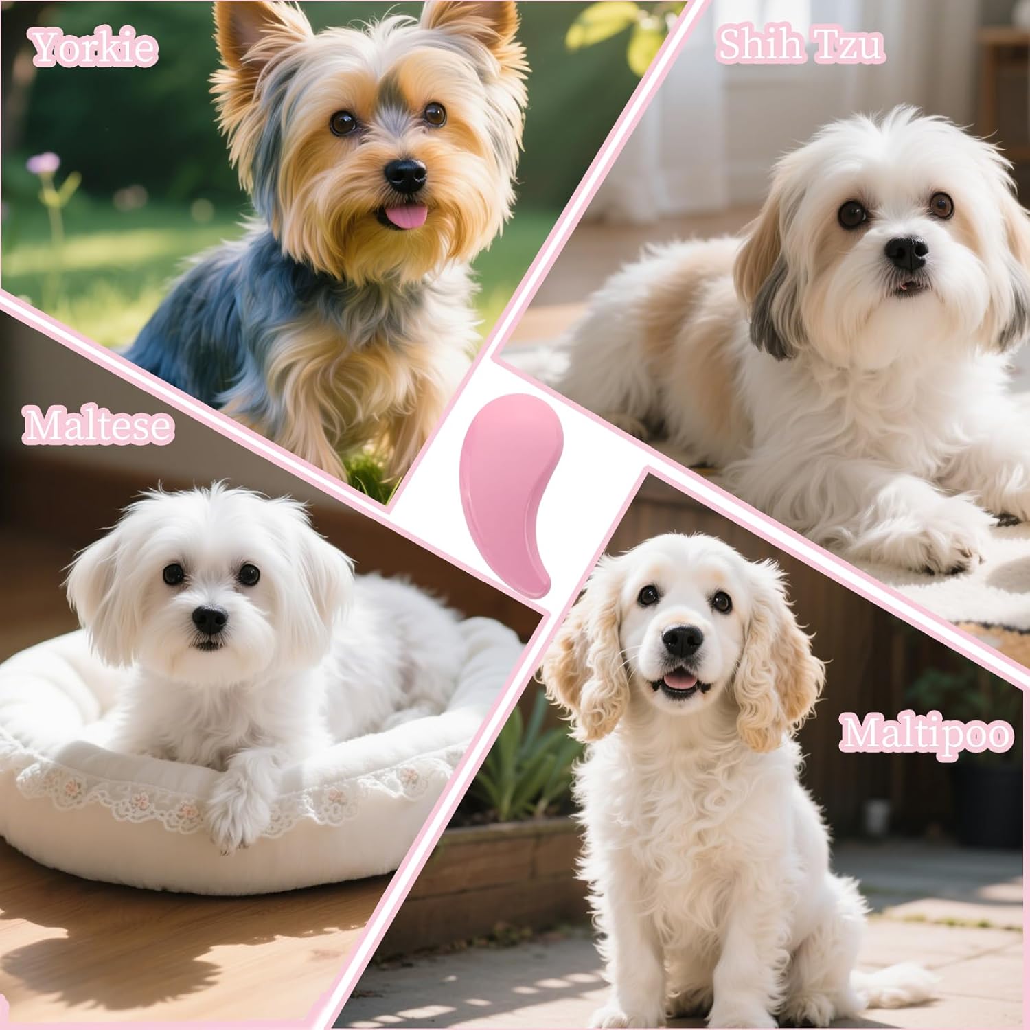 • Innovative Two-Piece Grooming Solution Elevate your small dog grooming routine with our exclusive comma-shaped brush set, featuring a main grooming brush and a dedicated small cleaning comb. The comma-shaped main brush, designed with ultra-soft bristles, is tailor-made for small breeds like Yorkies, Shih Tzus, and Maltese, gently gliding through their delicate coats to detangle knots and remove loose hair.