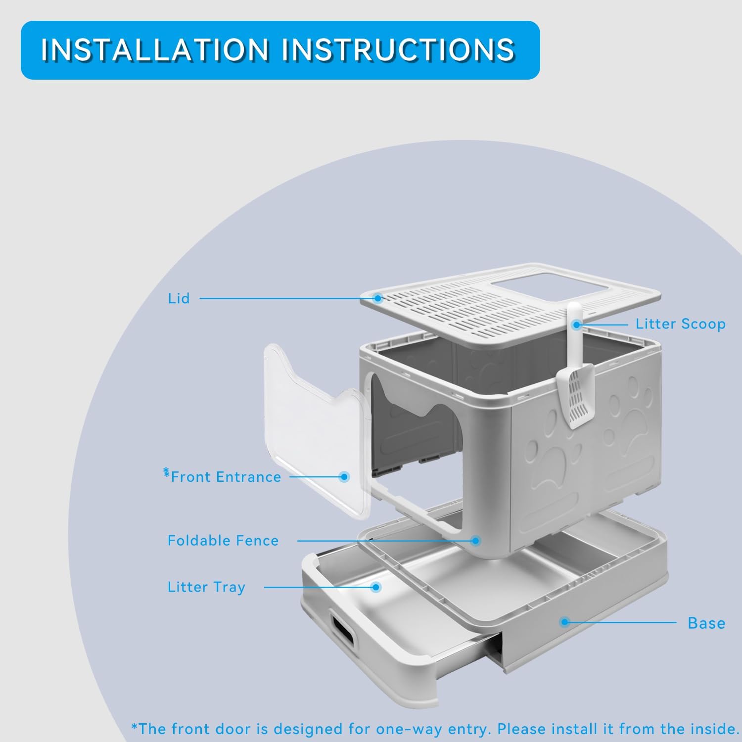 Tired of Lingering Odors, Scattered Litter, and Difficult Cleaning? Upgrade Your Cat Care with the Helntova Foldable Stainless Steel Enclosed Litter Box!Discover the ultimate solution designed for discerning cat owners and their beloved pets. The Helntova litter box tackles common frustrations head-on, combining innovative design with premium materials for a cleaner home and a happier cat. DESIGN FEATURES: Superior Hygiene with Stainless Steel: At the heart of our design is the Electropolished Stainless Steel Tray. Unlike plastic, this premium surface helps reduce scratches and stains, is less likely to absorb odors compared to plastic, and makes cleaning incredibly easy. Simply wipe or rinse for a fresh, hygienic space your cat deserves. Enjoy long-lasting durability and say goodbye to stubborn smells! Maximum Odor & Litter Control: Our fully enclosed design with a secure lid acts as a powerful barrier, effectively trapping unpleasant odors inside. It also significantly minimizes litter scatter during digging and exit, keeping your floors cleaner. Plus, it offers your cat the privacy they naturally prefer. Effortless Cleaning Routine: Forget awkward scooping! The convenient pull-out drawer allows quick and easy access for daily maintenance without needing to dismantle the box. Combined with the non-stick stainless steel tray, cleaning becomes a breeze. A matching litter scoop is included and stores neatly on the side. Drastically Reduced Litter Tracking: Our clever one-way entry (front) and top-exit design is a game-changer for clean floors. As your cat exits through the top, the textured grate gently removes litter particles from their paws, dropping them back into the stainless steel tray below. Space-Saving Foldable Design: Perfect for any living space! When unfolded , the interior is roomy enough for most cats to turn around comfortably. Need to store it or take it on the go? It cleverly folds down to a compact 4.9" high , ideal for apartments, small spaces, or travel. Accessible for All Cats: The lower front entry ensures easy access for kittens, senior cats, or those with shorter legs, making it a truly versatile choice for multi-cat households or cats with mobility considerations. SPECIFICATIONS: Unfolded Dimensions: 20" L x 16" W x 15.2" H Folded Dimensions: 20" L x 16" W x 4.9" H Available Colors: Gray, Blue, Pink NOTES: · Front Door Installation: The front door is designed for one-way entry. Please install it from the inside. For two-way access, carefully break off the two small tabs at the bottom of the door panel. · High Urinators: If your cat urinates high against the walls, this product may not be suitable. Invest in a cleaner, fresher home and a more comfortable experience for your cat. Choose the Helntova Foldable Stainless Steel Litter Box – the clean, durable, and convenient solution you've been searching for.