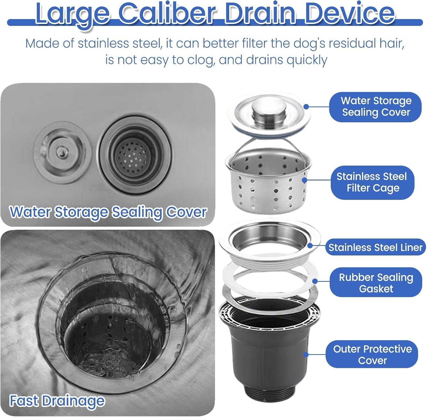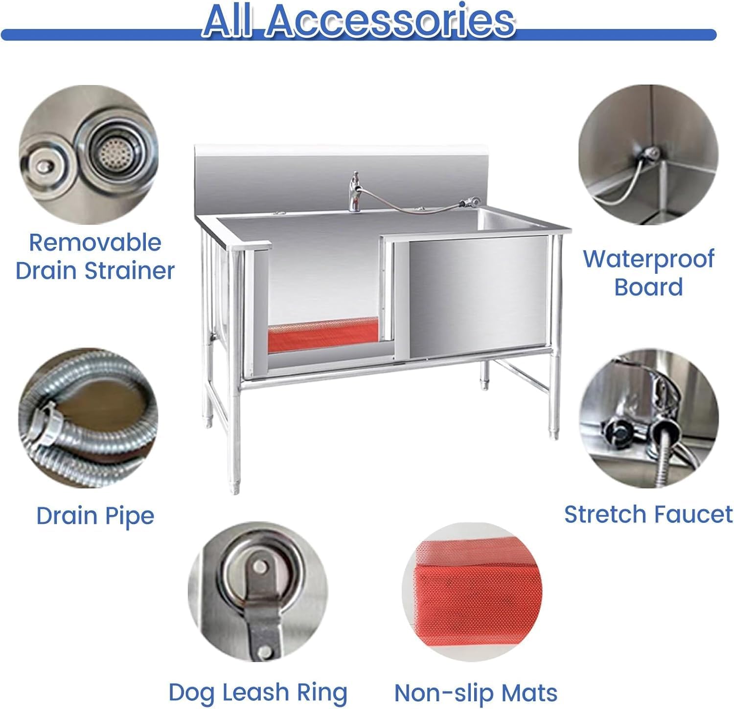 - Specification:Material: Stainless Steel Color: Silver Weight Capacity: 200 kgOverall Height: 115 cmWidth: 70 cmLength: 120 cm, 135 cmDepth: 40 cm, 50cm- Feature:One-piece design, just install the legs, easy to installStainless steel material, rounded corners will not hurt petsDog tether ring can prevent pets from running around during bathingStainless steel drainer can better filter dog hair and debris to avoid cloggingAnti-slip mats can prevent dogs from standing safely during bathing and avoid slippingThe left-opening door design allows pets to enter and exit independently or with assistanceThe longest faucet can be pulled out to 120 cm, no dead angle to wash the dog, more convenient to use- Package Includes:1 x Dog Washing Station1 x Removable Drain Strainer1 x Drain Pipe1 x Dog Leash Ring1 x Non-slip Mats1 x Waterproof Board1 x Stretch Faucet- Tips:There may be an error of 1-3 cm due to manual measurement.There may be chromatic aberration due to the difference between the recording lamp and the display. Please refer to the actual product.