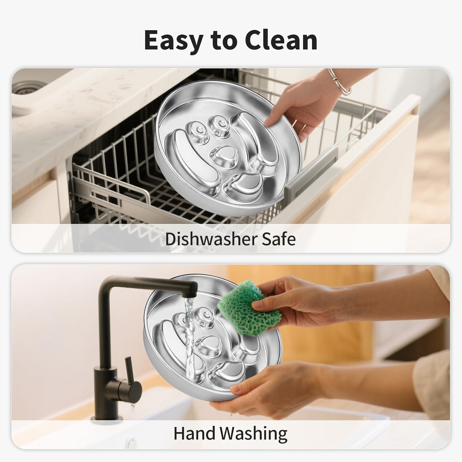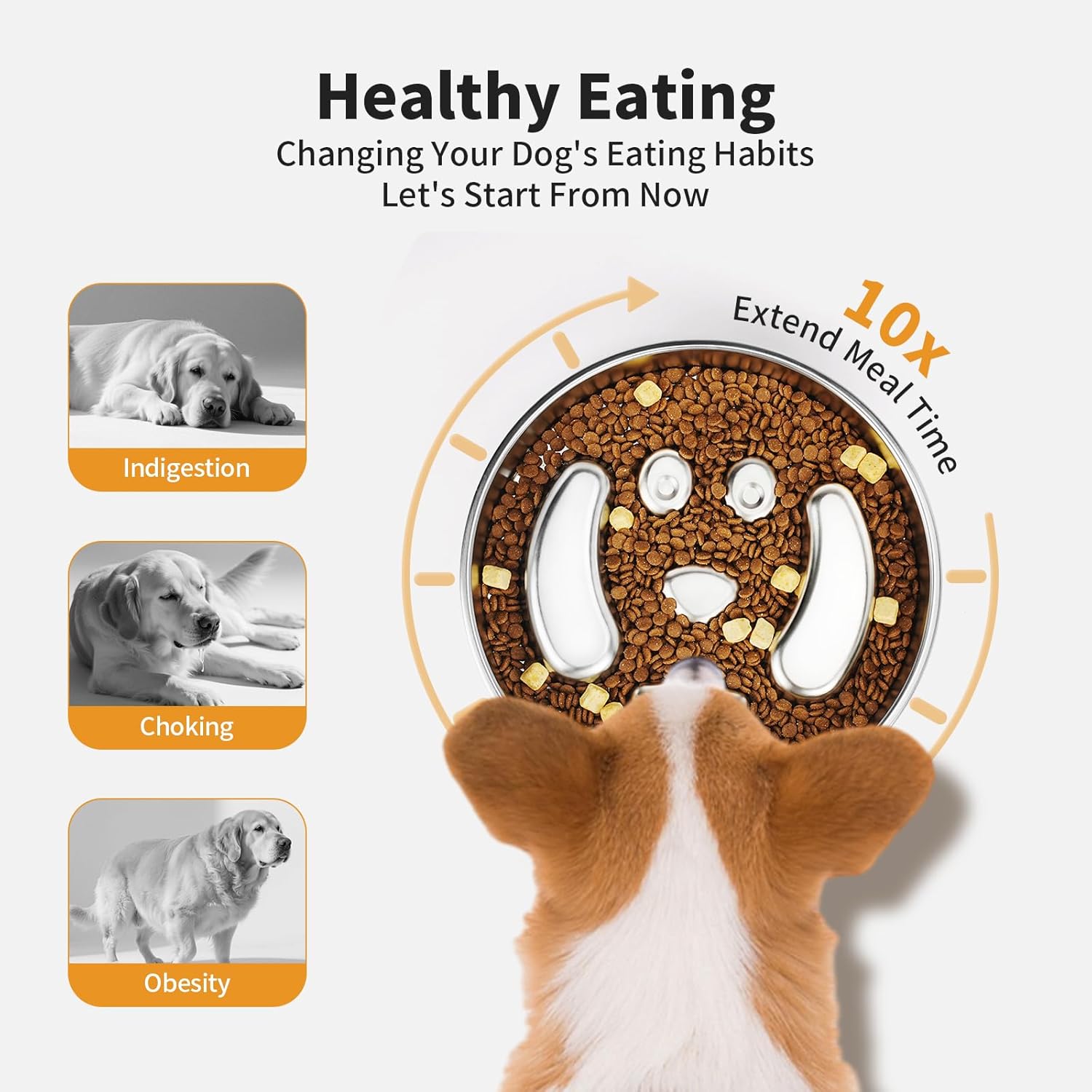 About this item Slows Down Fast Eating & Prevents Bloat: Designed with a raised dog bone pattern, this slow feeder dog bowl naturally slows eating, helping reduce the risks of choking, indigestion, and bloat while promoting healthier mealtime habits Premium 304 Stainless Steel Construction: Made from food-grade 304 stainless steel, this durable bowl is rust-resistant, odor-free, and built to withstand daily use without cracks or stains, making it a safe and long-lasting choice for your pup Two-in-One Feeding Solution: Innovative dual-purpose design allows you to use the raised side as an anti-gulping puzzle feeder for main meals, while the smooth flip side is perfect for snacks, spreads, or licking, saving space and keeping dogs engaged Hygienic & Easy to Clean: The dishwasher-safe stainless steel surface resists residue and buildup, ensuring every meal is fresh and sanitary. A quick rinse or cycle keeps it sparkling clean with minimal effort for busy pet parents Perfect Portion Control for Small & Medium Dogs: With a recommended 2-cup capacity, this bowl provides ideal portions for small to medium breeds, supporting healthy digestion, weight management, and preventing overeating every day › See more product details