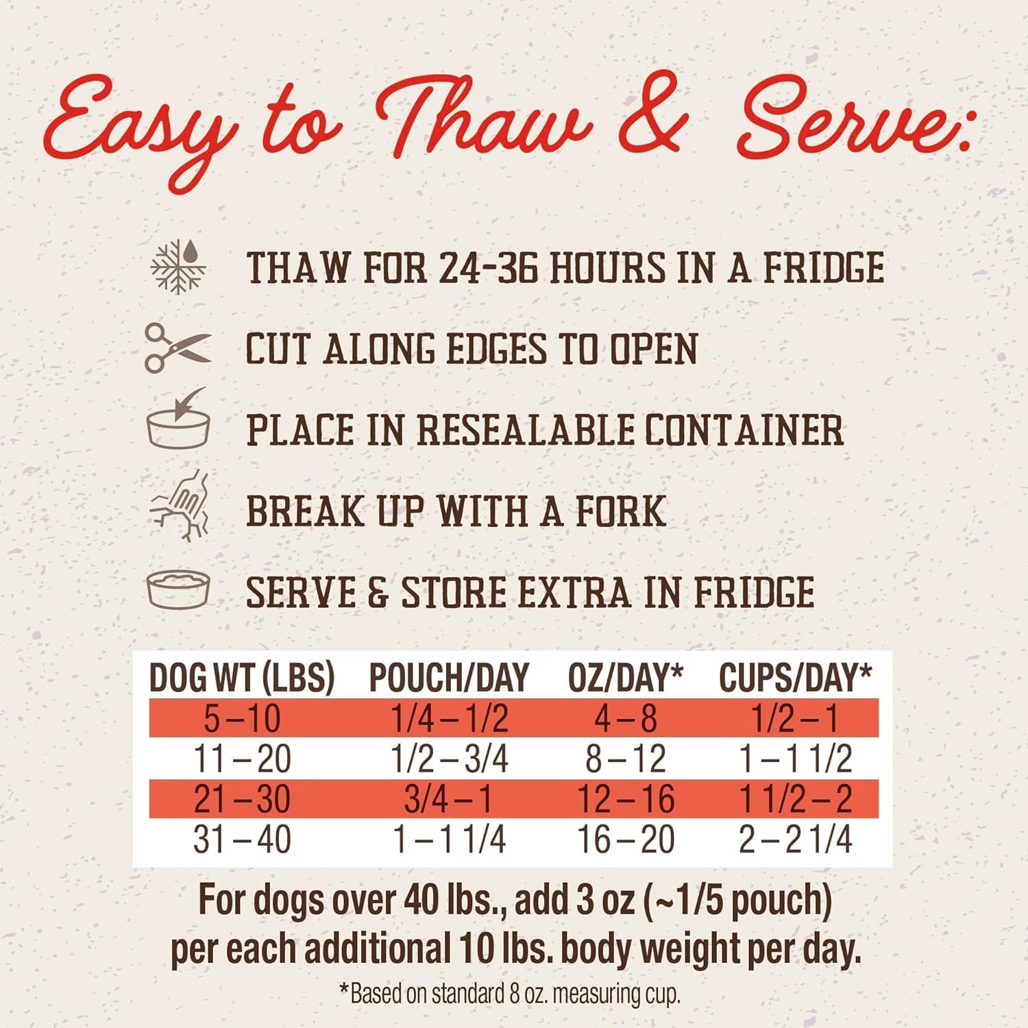 - Directions: Store in freezer. When ready to feed, thaw in refrigerator in original packaging. May take 24-36 hours to thaw completely. Once thawed, cut package along 3 sides to open (using caution as our food is nice & juicy!); place food and broth into a resealable container, use a fork to break up food into consistent texture and ensure broth is well mixed. Portion daily as needed. Keep remaining food refrigerated & stored in a sealed container. Food should be used within 5 days of thawing. Serve as a complete & balanced meal or topper using guidelines below. Optimal feeding amounts may vary with age, size, neuter status, breed & activity level. Fresh water should be available at all times. For Adults |Body Weight (lbs)|Pouches per Day|Ounces per Day| |---|---| |5-10|1/4 - 1/2|4-8| |11-20|1/2 - 3/4|8-12| |21-30|3/4 - 1|12-16| |31-40|1 - 1 1/4|16-20| |40+|1 - 1 1/4 (+1/5 per each additional 10 lbs)|16-20 (+3 per each additional 10 lbs)| Based on a standard 8 oz. measuring cup. For topper portions feed 3/4 oz (1 ½ tablespoons) daily per 10 lbs. of body weight. Adjust other food accordingly to maintain healthy weight. Puppies may need up to twice the amount of food as listed for an adult dog