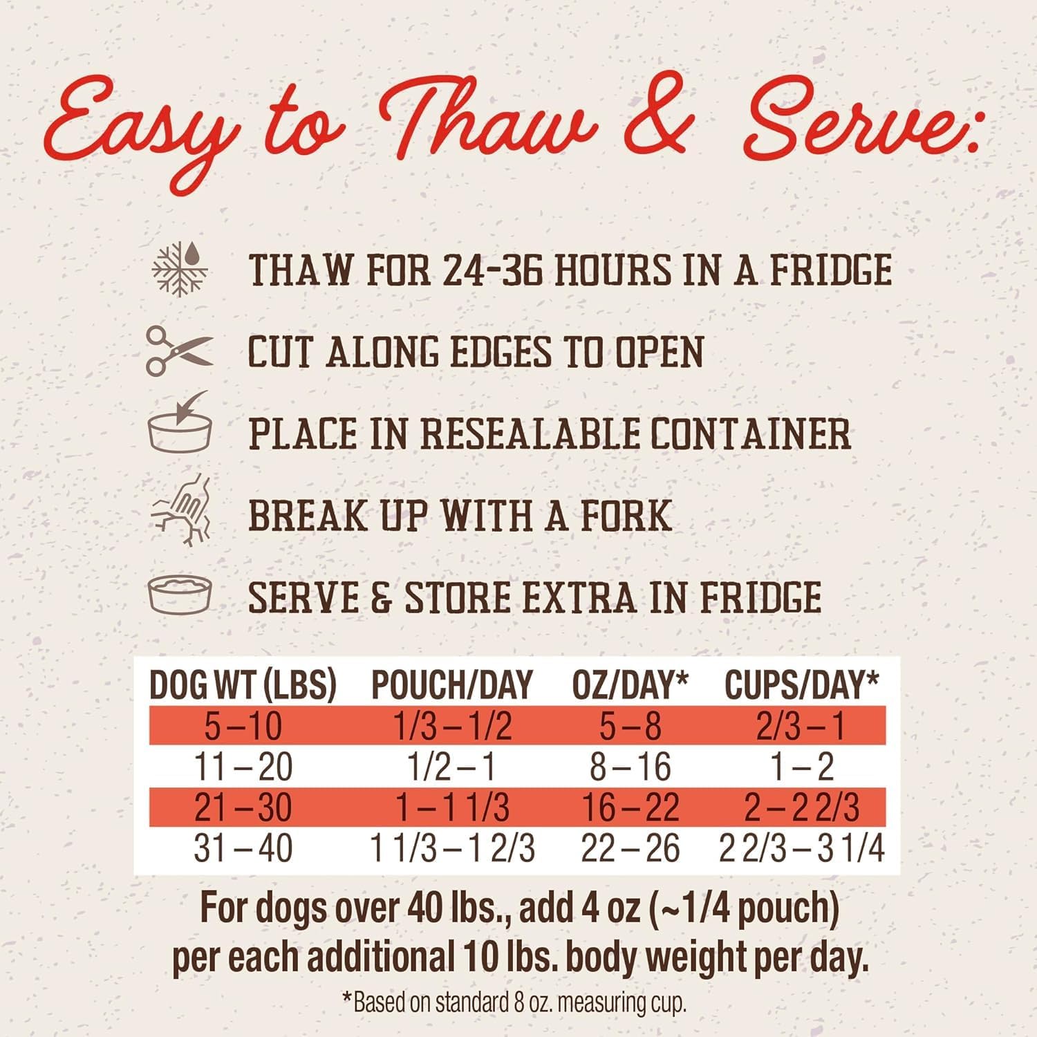 - Directions: Store in freezer. When ready to feed, thaw in refrigerator in original packaging. May take 24-36 hours to thaw completely. Once thawed, cut package along 3 sides to open (using caution as our food is nice & juicy!); place food and broth into a resealable container, use a fork to break up food into consistent texture and ensure broth is well mixed. Portion daily as needed. Keep remaining food refrigerated & stored in a sealed container. Food should be used within 5 days of thawing. Serve as a complete & balanced meal or topper using guidelines below. Optimal feeding amounts may vary with age, size, neuter status, breed & activity level. Fresh water should be available at all times. For Adults |Body Weight (lbs)|Pouches per Day|Ounces per Day| |---|---| |5-10|1/3 - 1/2|5-8| |11-20|1/2 - 1|8-16| |21-30|1 - 1 1/3|16-22| |31-40|1 1/3 - 1 2/3|22-26| |40+|1 1/3 - 1 2/3 (+1/4 per each additional 10 lbs)|22-26 (+4 per each additional 10 lbs)| Based on a standard 8 oz. measuring cup. For topper portions feed 3/4 oz (1 ½ tablespoons) daily per 10 lbs. of body weight. Adjust other food accordingly to maintain healthy weight. Puppies may need up to twice the amount of food as listed for an adult dog