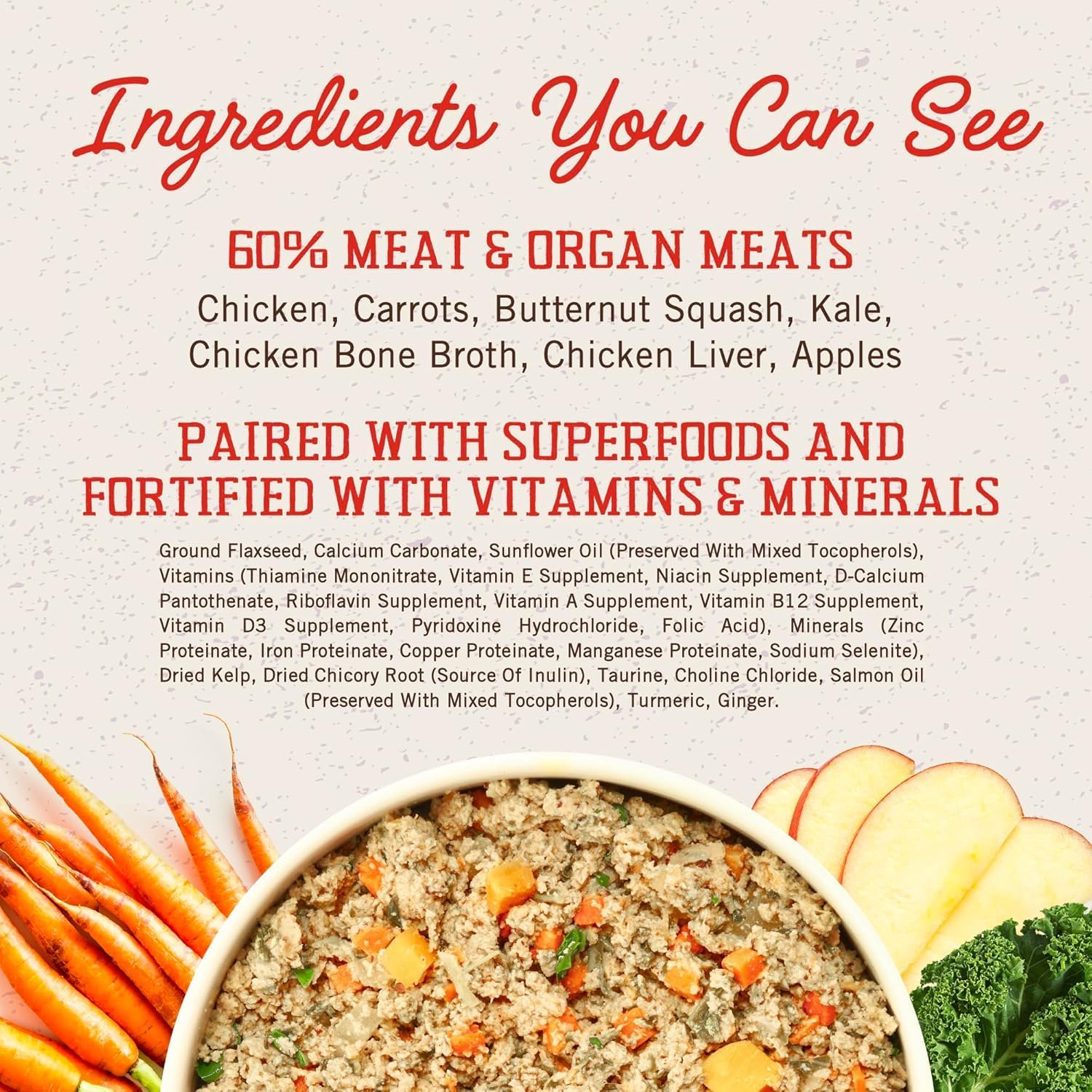 Give your dog the best with our Chicken Recipe, crafted from 100% human-grade whole foods. This single protein recipe features cage-free chicken as the #1 ingredient, combined with nutrient-rich organ meats, healthy fruits, veggies, superfoods, and botanicals. Enhanced by the irresistible taste of juicy chicken bone broth, this grain-free and legume-free meal is perfect for dogs of all life stages. Packed with DHA from salmon oil for brain and eye health and taurine for heart support, it’s gently cooked and flash-frozen to lock in taste and nutrition. Just thaw and serve as a complete meal or a tasty topper!