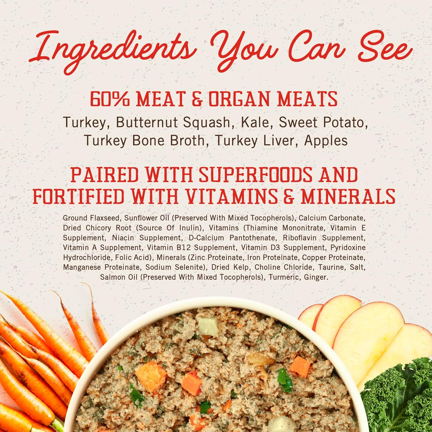 Give your dog the best with our Turkey Recipe, made from 100% human-grade whole foods. This single protein recipe features cage-free turkey as the #1 ingredient, combined with nutrient-rich organ meats, healthy fruits, veggies, superfoods, and botanicals. Enhanced by the delicious flavor of juicy turkey bone broth, this grain-free and legume-free meal is perfect for dogs of all life stages. With added taurine for heart health and DHA from salmon oil for brain support, it’s gently cooked and flash-frozen to preserve all the goodness. Just thaw and serve as a complete meal or a tasty topper!
