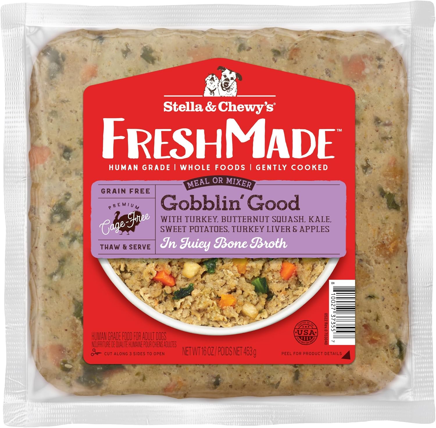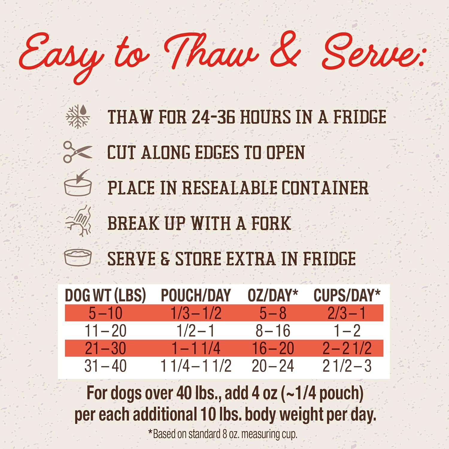 - Directions: Store in freezer. When ready to feed, thaw in refrigerator in original packaging. May take 24-36 hours to thaw completely. Once thawed, cut package along 3 sides to open (using caution as our food is nice & juicy!); place food and broth into a resealable container, use a fork to break up food into consistent texture and ensure broth is well mixed. Portion daily as needed. Keep remaining food refrigerated & stored in a sealed container. Food should be used within 5 days of thawing. Serve as a complete & balanced meal or topper using guidelines below. Optimal feeding amounts may vary with age, size, neuter status, breed & activity level. Fresh water should be available at all times. For Adults |Body Weight (lbs)|Pouches per Day|Ounces per Day| |---|---| |5-10|1/3 - 1/2|5-8| |11-20|1/2 - 1|8-16| |21-30|1 - 1 1/4|16-20| |31-40|1 1/4 - 1 1/2|20-24| |40+|1 1/4 - 1 1/2 (+1/4 per each additional 10 lbs)|20-24 (+4 per each additional 10 lbs)| Based on a standard 8 oz. measuring cup. For topper portions feed 3/4 oz (1 ½ tablespoons) daily per 10 lbs. of body weight. Adjust other food accordingly to maintain healthy weight. Puppies may need up to twice the amount of food as listed for an adult dog