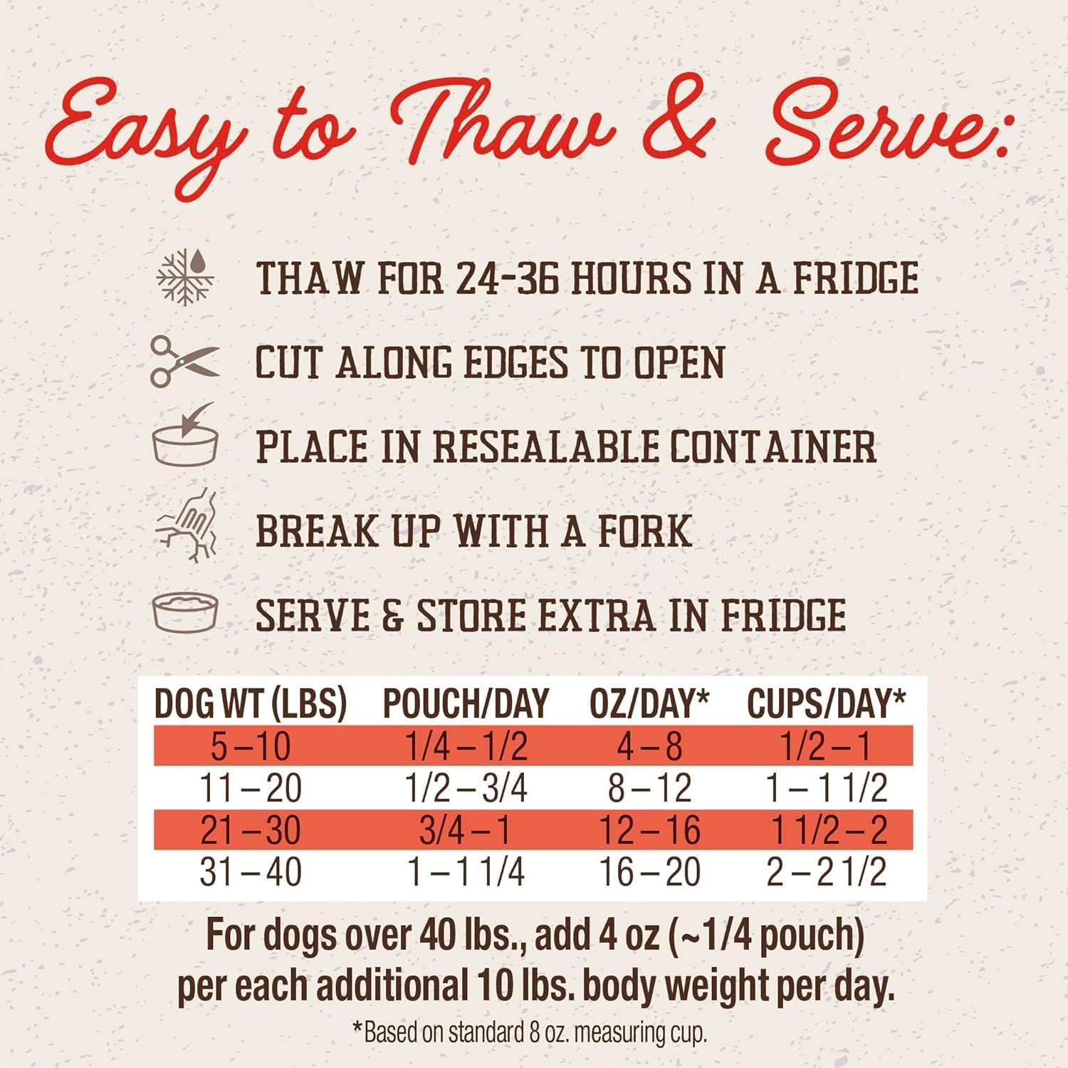 - Directions: Store in freezer. When ready to feed, thaw in refrigerator in original packaging. May take 24-36 hours to thaw completely. Once thawed, cut package along 3 sides to open (using caution as our food is nice & juicy!); place food and broth into a resealable container, use a fork to break up food into consistent texture and ensure broth is well mixed. Portion daily as needed. Keep remaining food refrigerated & stored in a sealed container. Food should be used within 5 days of thawing. Serve as a complete & balanced meal or topper using guidelines below. Optimal feeding amounts may vary with age, size, neuter status, breed & activity level. Fresh water should be available at all times. For Adults |Body Weight (lbs)|Pouches per Day|Ounces per Day| |---|---| |5-10|1/4 - 1/2|4-8| |11-20|1/2 - 3/4|8-12| |21-30|3/4 - 1|12-16| |31-40|1 - 1 1/4|16-20| |40+|1 1/4 (+1/4 per each additional 10 lbs)|20(+4 per each additional 10 lbs)| Based on a standard 8 oz. measuring cup. For topper portions feed 3/4 oz (1 ½ tablespoons) daily per 10 lbs. of body weight. Adjust other food accordingly to maintain healthy weight. Puppies may need up to twice the amount of food as listed for an adult dog