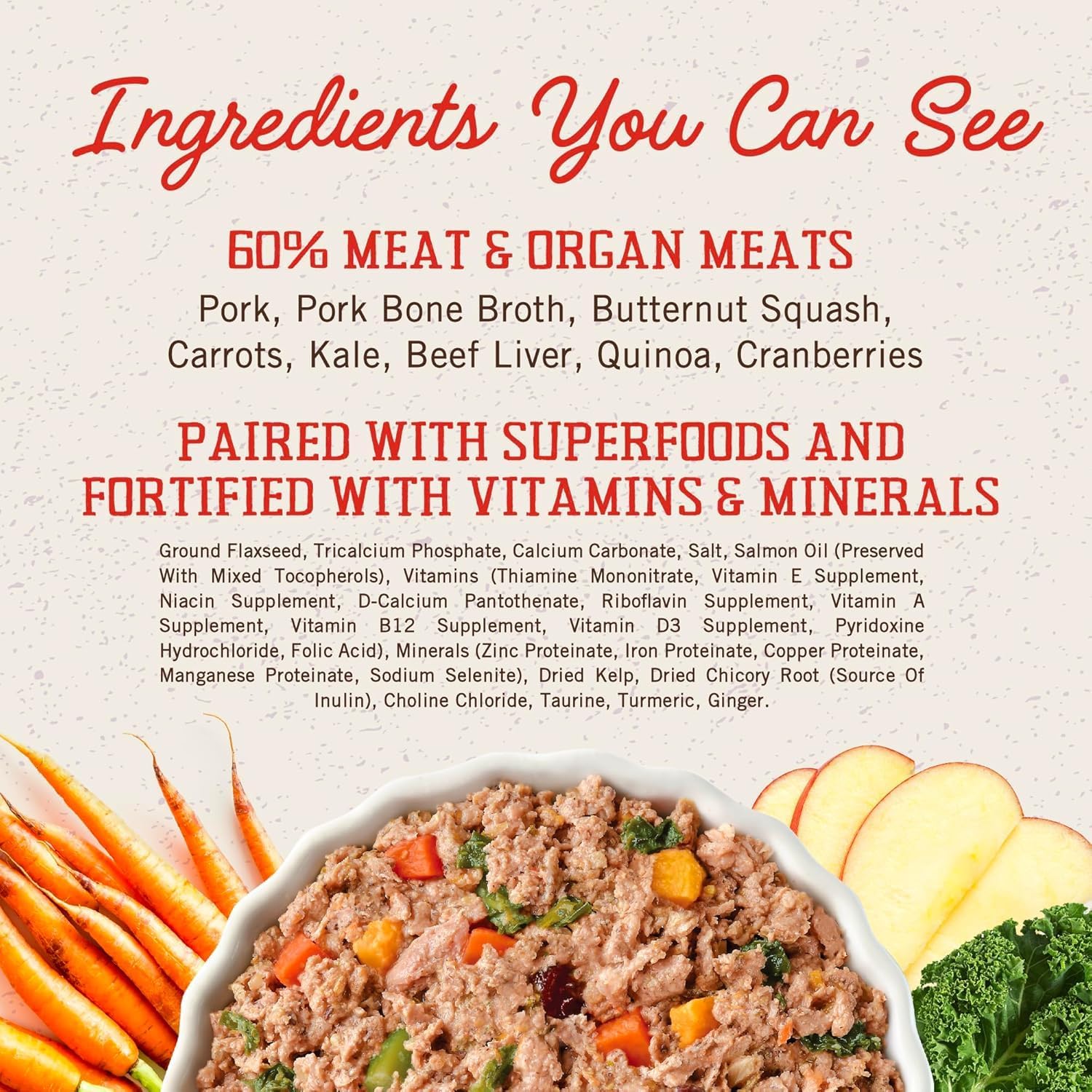 Give your dog the best with our Pork & Quinoa Recipe, made from 100% human-grade whole foods. This recipe features juicy pork combined with nutrient-rich organ meats, healthy fruits, veggies, superfoods, and botanicals, plus quinoa for a nutritious source of fiber and vitamins. Enhanced by the delicious flavor of juicy pork bone broth, this complete and balanced meal is perfect for dogs of all life stages. With DHA from salmon oil for brain health and taurine for heart support, it’s gently cooked and flash-frozen to preserve taste and nutrition. Just thaw and serve as a complete meal or a tasty topper!