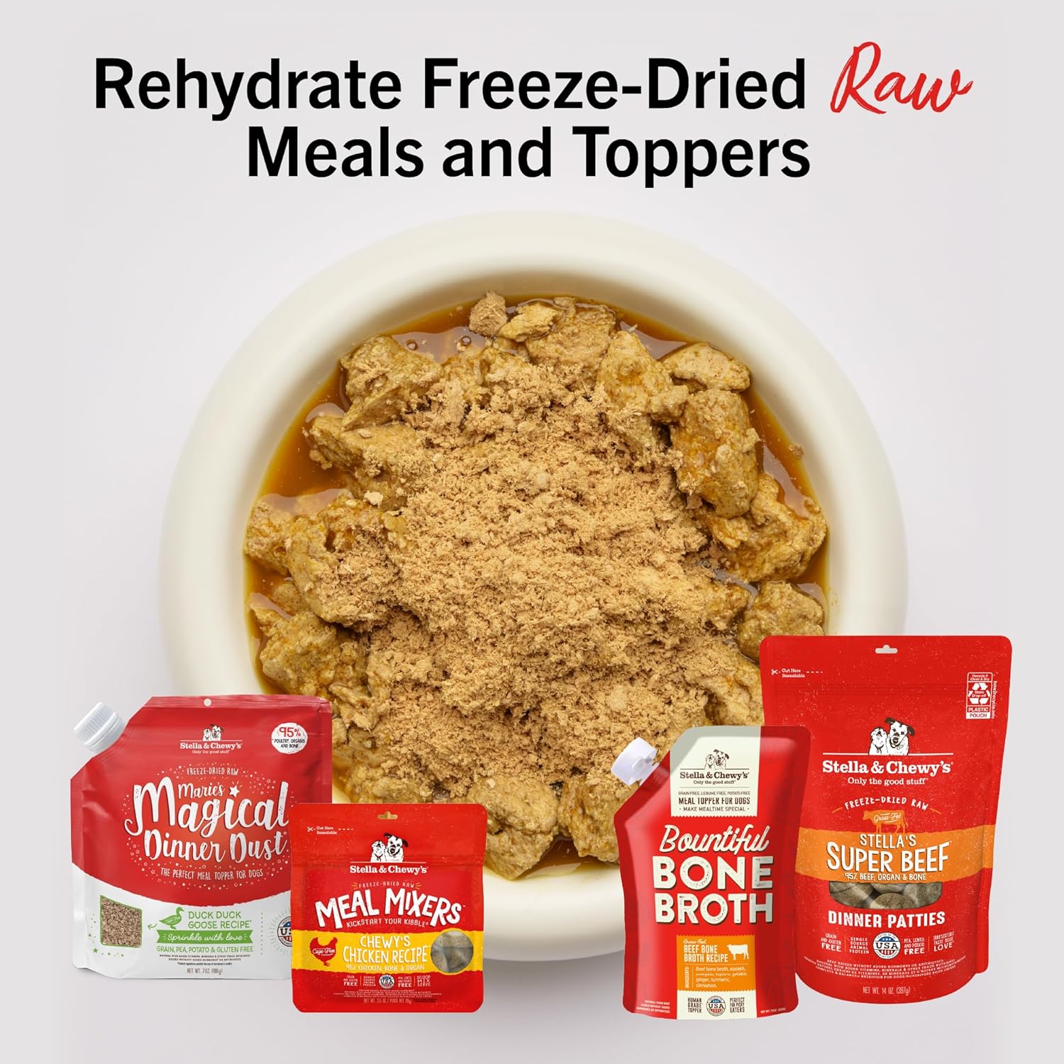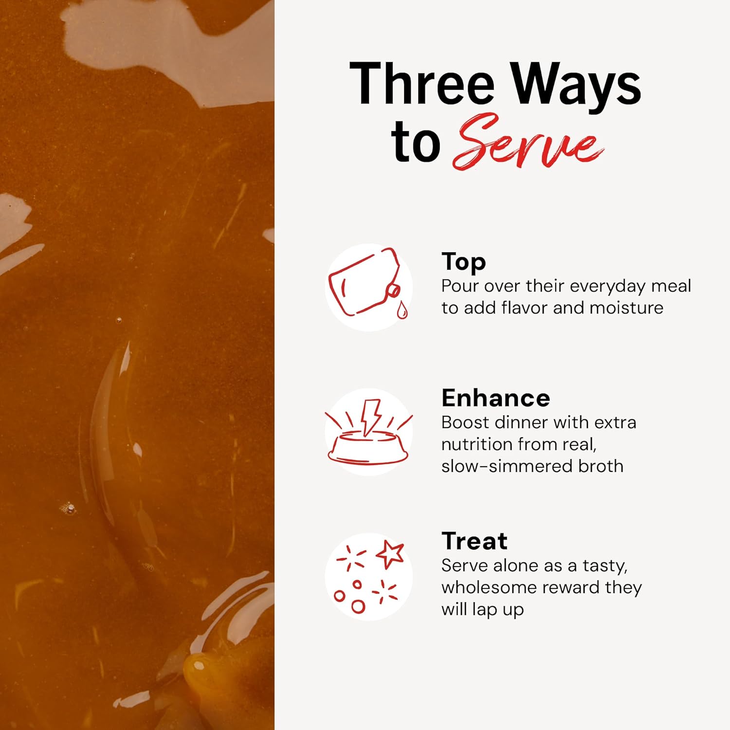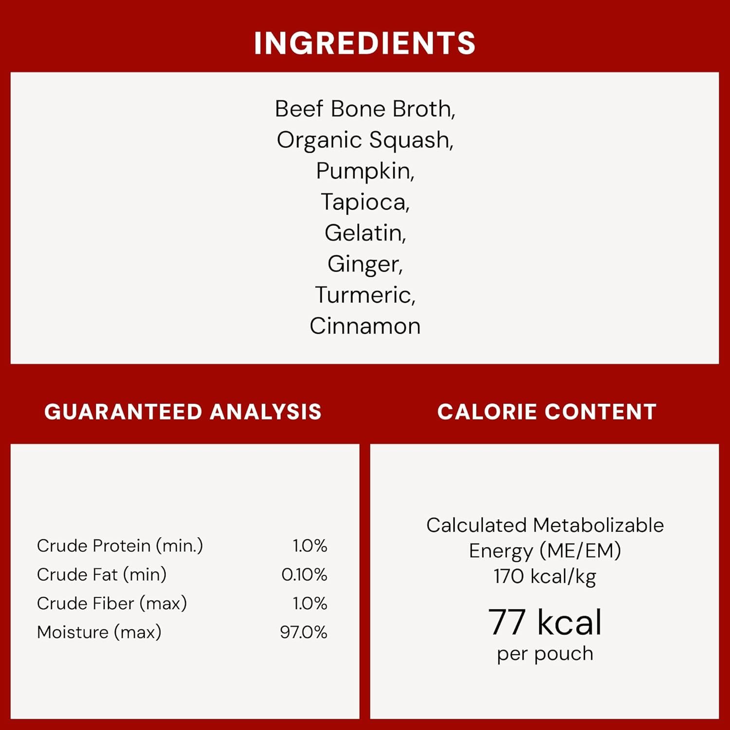 Transform your dog's ordinary meal into a nutrient-rich feast with Stella & Chewy's Premium Grass-Fed Beef Bone Broth. Our human-grade bone broth is slowly simmered in small batches to extract maximum nutrients, including vital collagen, gelatin, and amino acids that support your dog's joint health, digestion, and immune system. Unlike ordinary broths, our recipe features 100% grass-fed beef bones and is enhanced with anti-inflammatory superfoods like turmeric and cinnamon. This powerful combination not only supports your dog's overall wellness but adds a delicious flavor that makes every meal more appealing and hydrating. Key Benefits: - Rich in natural collagen for joint health and mobility - Supports gut health and digestion - Boosts immune system function - Perfect for picky eaters and small dogs - Ideal for adding moisture to dry food Each 16 oz resealable pouch is made in USDA-inspected facilities in the USA, following strict quality control standards. Our bone broth is grain-free, gluten-free, and contains no artificial preservatives, making it perfect for dogs with food sensitivities. What's Included: - 1 x 16 fl oz resealable pouch - Serving guide for dogs of all sizes - 100% satisfaction guarantee