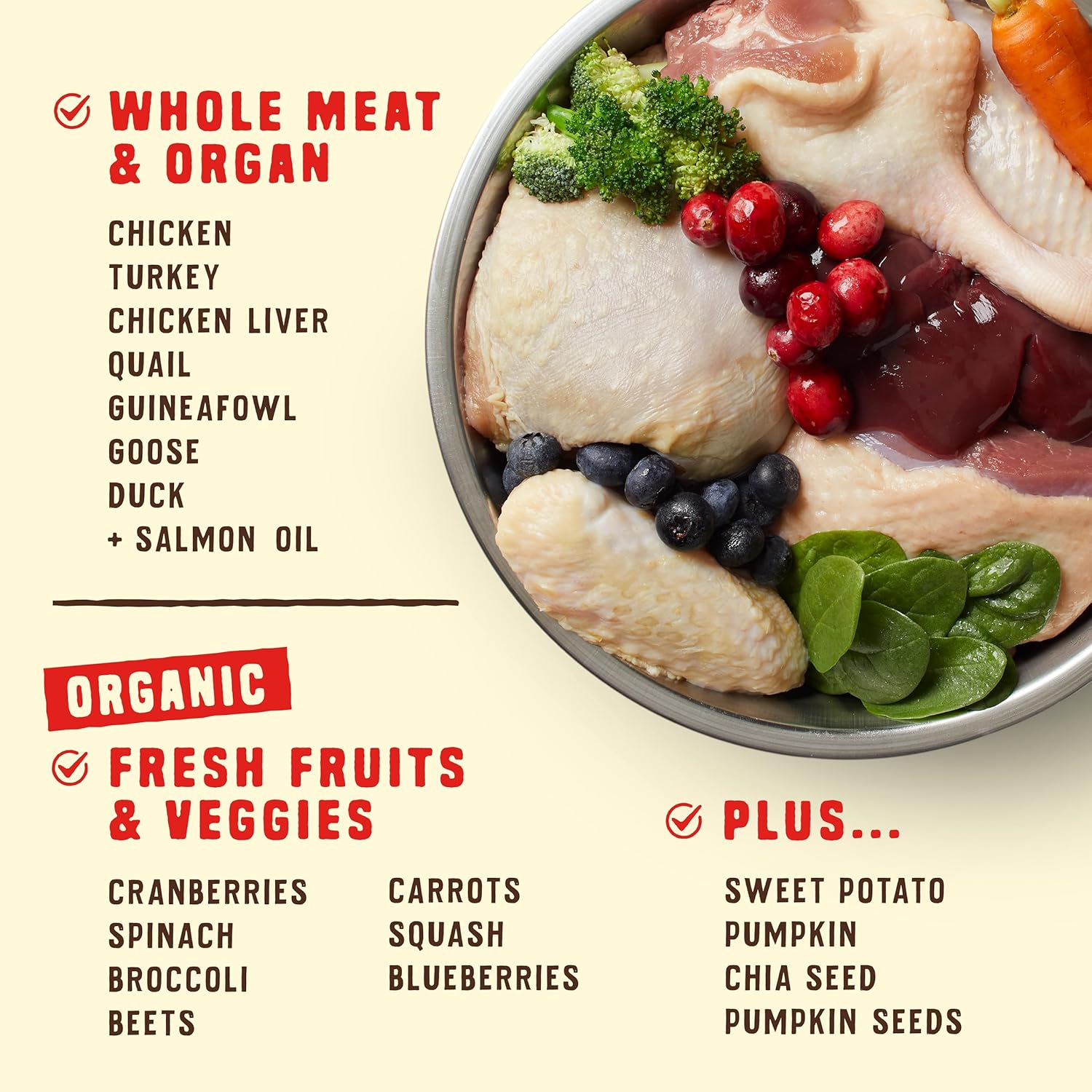 Transform your picky eater's mealtime with Stella & Chewy's Wild Red Raw Blend Kibble - the premium dog food that combines the convenience of kibble with the nutritional benefits dogs naturally crave. Drawing inspiration from the ancestral canine diet, our unique formula features kibble coated with freeze-dried raw food plus freeze-dried raw chunks for exceptional taste and nutrition that even the pickiest eaters love.Made with SIX premium poultry protein sources (chicken, turkey, quail, guineafowl, goose, and duck), Wild Red delivers superior nutrition with 93% of protein coming from animal sources including muscle meat, organs, and cartilage. This high-protein, low-carb, grain-free and legume-free formula contains no peas, lentils, potatoes, by-product meals, artificial colors, flavors, or preservatives.Our formula is enhanced with vitamins, minerals, and amino acids to support your dog's overall well-being. Naturally occurring glucosamine and chondroitin help support hip and joint health, while antioxidants from fruits and vegetables boost immune function. Omega fatty acids from chia seeds and salmon oil promote healthy skin and a shiny coat, and added fiber and probiotics support digestive health.