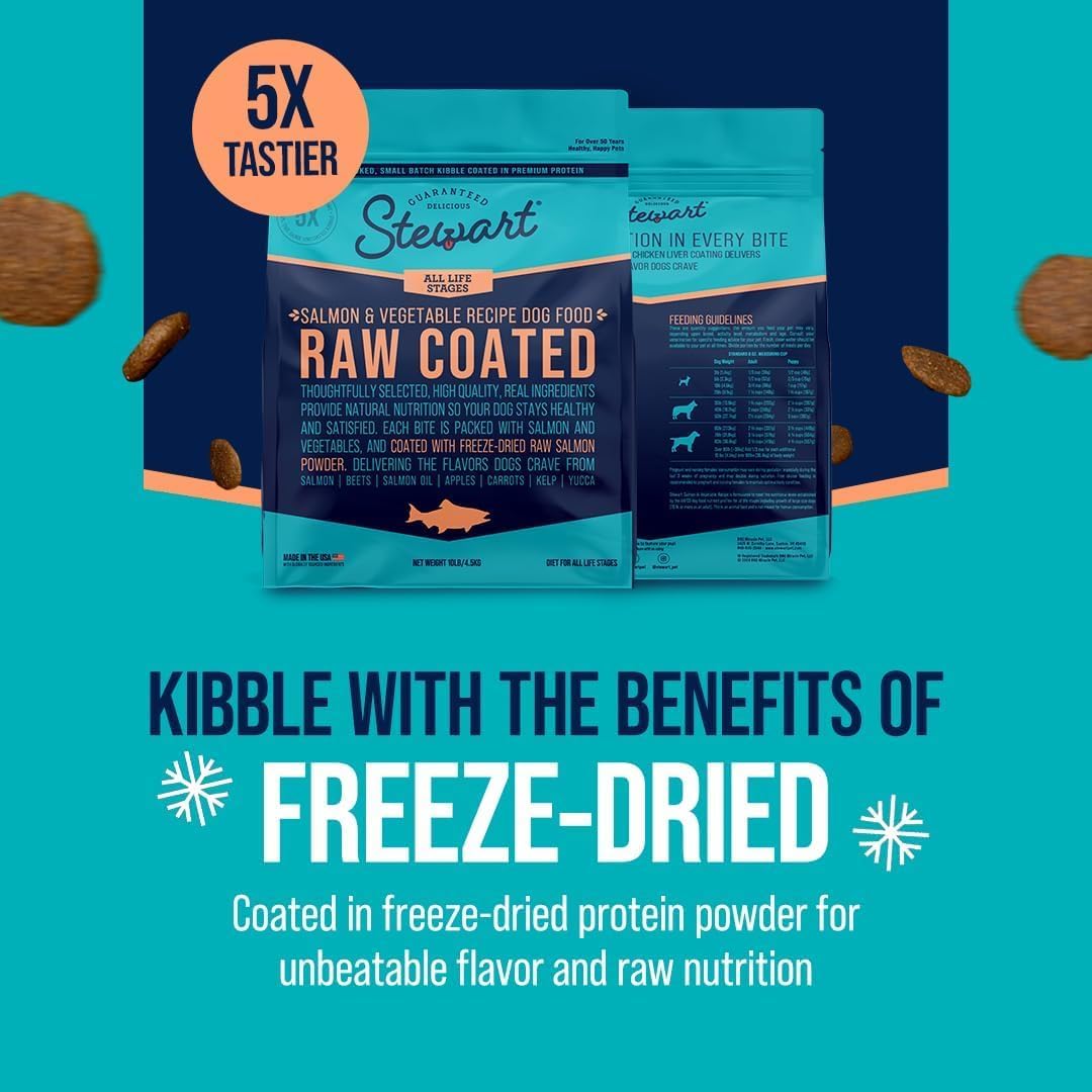 Nutritious and delicious kibble preferred by dogs 5x more than the same uncoated kibble. Stewart Raw Coated Salmon & Vegetable Dog Food is made with limited ingredients that provide a balanced diet for your puppy. This salmon dog food is coated with freeze-dried raw salmon powder and provides nutrition you can feel confident about and a taste your pet will crave. This is a great choice for training, offering a high-protein, nutritious, and flavorful reward. It’s rich in omega-3 and omega-6 fatty acids to promote skin and coat health and powerful prebiotics and probiotics for dogs to support gut health. We’ve also added natural glucosamine and chondroitin to support joint function for your pup. This kibble features high quality, real ingredients like salmon and raw vegetables that are coated in delicious protein powder and is packaged in a resealable bag to keep the food fresh. Stewart offers a large mix of dog products for your best friend like freeze-dried dog treats and healthy dog treats. Our Salmon Raw Coated Kibble works as small dog food, dry dog food for large dogs, & senior dog food, and can be put in your automatic dog feeder. Our dog food is made in the USA and is cooked low and slow in small batches to preserve vital nutrients, vitamins, and minerals, ensuring the highest quality products for dogs. Our kibble is designed for pets of all sizes and ages – we love them all! Choose Stewart – because it’s real food, and nothing else.