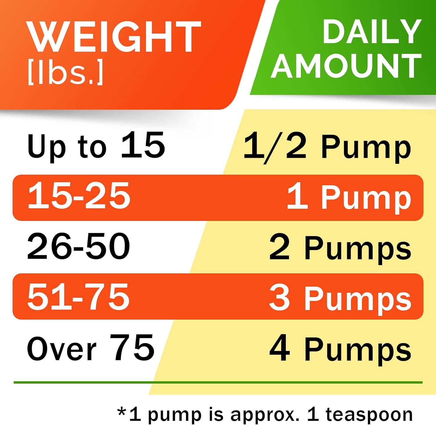 - Directions: Serve daily amount based on pet's weight up to 15lbs - 1/2 pump; 15-25lbs - 1 pump; 26-50lbs - 2 pumps; 51-75lbs - 3 pumps; over 75lbs - 4 pumps.