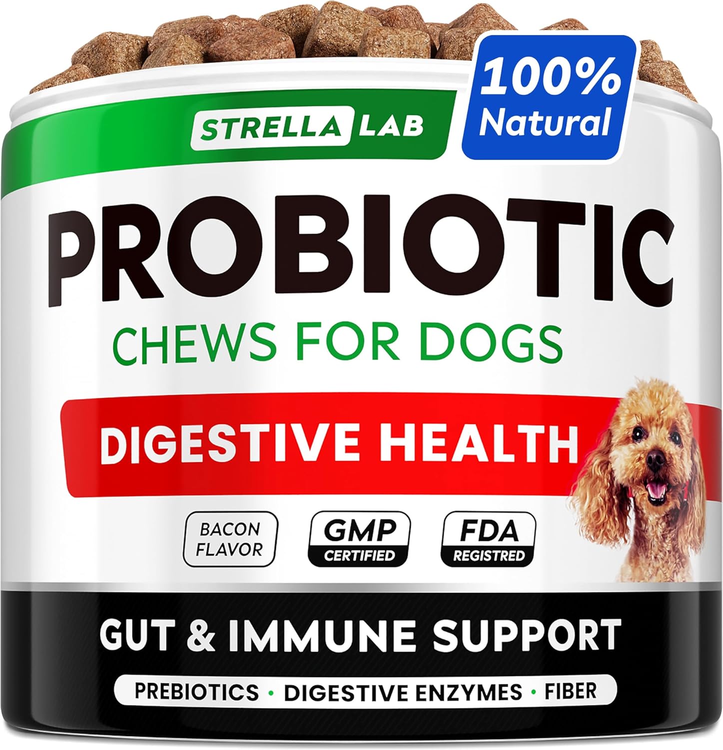 About this item SUPPORT HEALTHY TUMMY - packed with all essential probiotic and prebiotic, fiber and enzymes, these probiotic chews for dogs will help easy varios stomach issues like gas, diareah, sensitive or upset stomach, constapation, gas, acid, loose stool, bad breath etc. ALLERGY RELIEF AND IMMUNITY BOOST - by supporting healthy digestion, these probiotics for dogs chewable supplements help your pets take control of food allergies, that may manifest in skin conditions as well. Plus healthy digestion leads to strong immune. DELICIOUS FLAVOR YOUR BUDDY WILL LOVE - we made sure your canine friend will love our bacon flavored chewable. No hassle with pills, powders, tablets or capsules. GREAT VALUE - 120 CHEWS PER JAR. You'll get a huge jar with 120 probiotic bites, that will provide up to 3 month supply of premium chewable treats. Made in USA our product has no soy, no corn, no dairy or sugar, no artificial flavoring, preservatives or hormones. ALL BREEDS, ALL AGES AND SIZE - chews are suitable for dogs of all breeds from small yorkie to large retriever, all ages from puppy to senior dogs. › See more product details