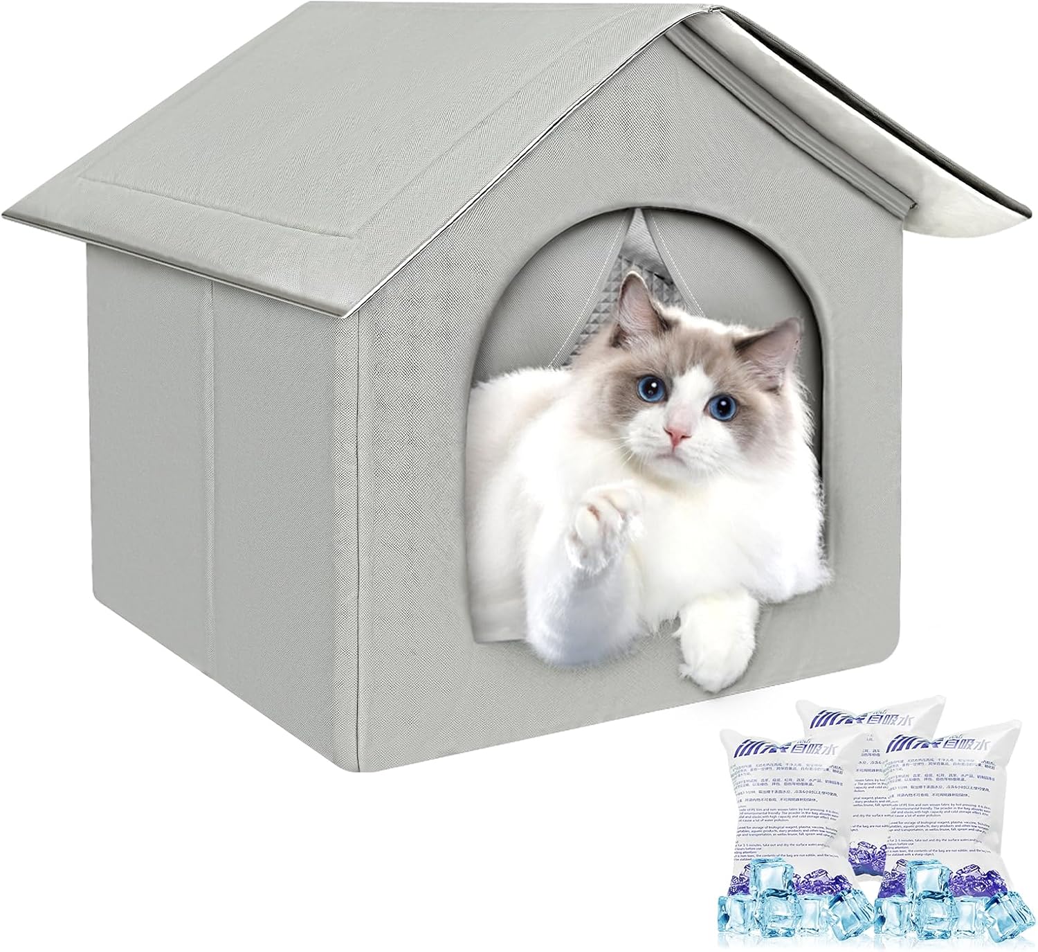 About this item UNIQUE & INNOVATIVE COOLING DESIGN: This cooling outdoor cat house made of high-quality insulated material contains 9 ice packs that provide a continuous cooling effect for 8-12 hours. And a cool cushion, The soft mat provides a more comfortable space for the cat. Designed to provide a comfortable and cool resting space for your kitty. WATERPROOF & FULLY INSULATED: The outside cat house is made of 900D Oxford cloth waterproof outer fabric with aluminum foil inside for complete insulation, and the prevents rainwater from getting into the inside of the cat shelter. The waterproof outside cat house can withstand the high winds and summertime precipitation that can protect kittens and feral cats from inclement weather. STRONG & STABLE CONSTRUCTION: The cat houses & condos are made of robust and sturdy waterproof PVC material. Compared with other outside cat houses, it is not easy to collapse, providing a safe and reliable shelter for the stray cats. Measuring 16.5 "x16.5 "x16.5 ", our summer cooling outdoor cat shelter is large enough to fit two adult cats or a mother cat and two kittens, giving your furry friends plenty of space to spread out, play, and unwind. EASY TO ASSEMBLE & FOLDABLE: Our cat house outdoor weatherproof is foldable and portable, you can easily disassemble and install it in one minute without other tools. Perfect for cats that sleep in garages, porches, barns, yards, and rescues. The smooth PVC surface is easy to clean, just wipe it down to keep it spotless, ensuring cats stays dry and comfortable. COMFORT AND SAFETY COMBINED: The outdoor cat shelter spacious interior offers a cozy space for your cat to rest, play, and seek shelter. Built with safety in mind, the sturdy construction and weatherproof material ensure cats is protected in any outdoor environment. Whether in backyard, balcony, or garden, this cat house blends seamlessly and provides an ideal home for feral cats. › See more product details
