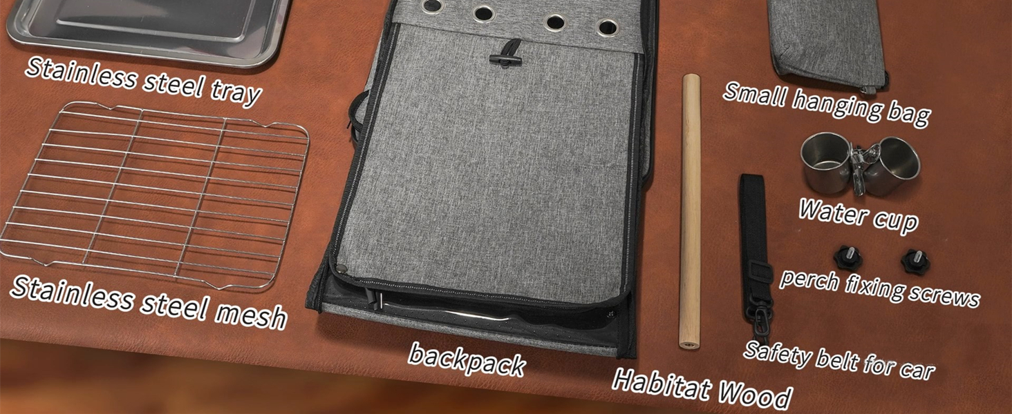 - Included Components: backpack, perch, bowls, small bag, tray, safety belt