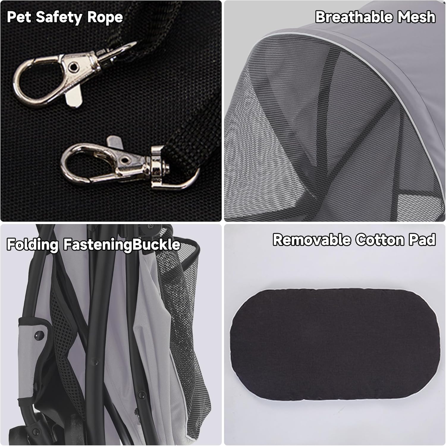About this item Superior Safety & Secure Design - Pet's safety is guaranteed with a reliable 2-point safety harness, sturdy locking brakes, and a stable 4-wheel frame. Our pet stroller ensures full-coverage safety for every adventure Breathable Comfort & Weather Protection - Pets enjoy excellent airflow through mesh windows and a shaded rain cover. The spacious interior offers a cozy ride, perfect for cats and dogs up to 33lbs All-Terrain Wheels & Smooth Handling - Four EVA wheels handle any surface with ease. 360° swivel front wheels offer effortless steering, and all-terrain tires absorb shocks for a smooth ride Quick 1-Second Fold & Easy Cleaning - Set up in 30 seconds with no tools needed! Our pet stroller folds compactly with one hand. Removable, wipe-friendly fabric allows hassle-free cleaning after outings Ultra-Portable & Travel Ready - Lightweight and compact when folded, this dog stroller fits easily in your car trunk. Perfect for daily walks, vet trips, and family travels › See more product details