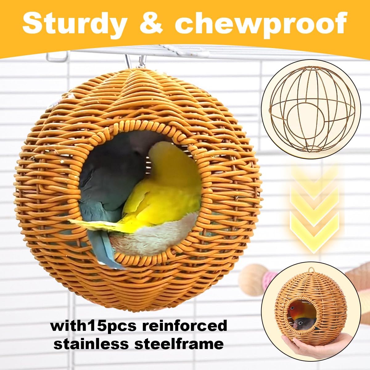 Specialized Bird Nest Hammock: Designed for cages requiring resting spaces and food-hiding areas, this parrot nest bed offers comfort, breathability, and chew-resistant durability. It serves as an ideal resting spot, activity area, and nesting site for your pet. Breathable Comfort Material: Constructed with steel frames and plastic, it ensures sturdiness and durability while facilitating easy rinsing and drying, effortlessly providing birds with a fresh resting environment. Bird Cage Padding: Features thick, soft plush material for warmth and comfort, protecting small pets from the cold and ideal for winter use. Convenient Installation: Includes snap-on chains for out-of-the-box use. Easily attaches to the cage frame without tools, eliminating complicated steps. All-Season Usage: Place the cushion at the bottom of the cage in winter to create a warm, cozy nest for birds. Remove the cushion in summer to promote airflow, ensuring the nest stays ventilated and fresh. Multi-functional Bird Habitat: The hanging bird nest size (15.5cm/6.1in×15.5cm/6.1in); The entrance diameter is (7cm/2.8in); This parrot hammock serves as a resting spot, hiding place, and nesting area. Suitable for parrot, parakeets, finch, canary, songbird, hummingbird, lovebird and other small birds. › See more product details